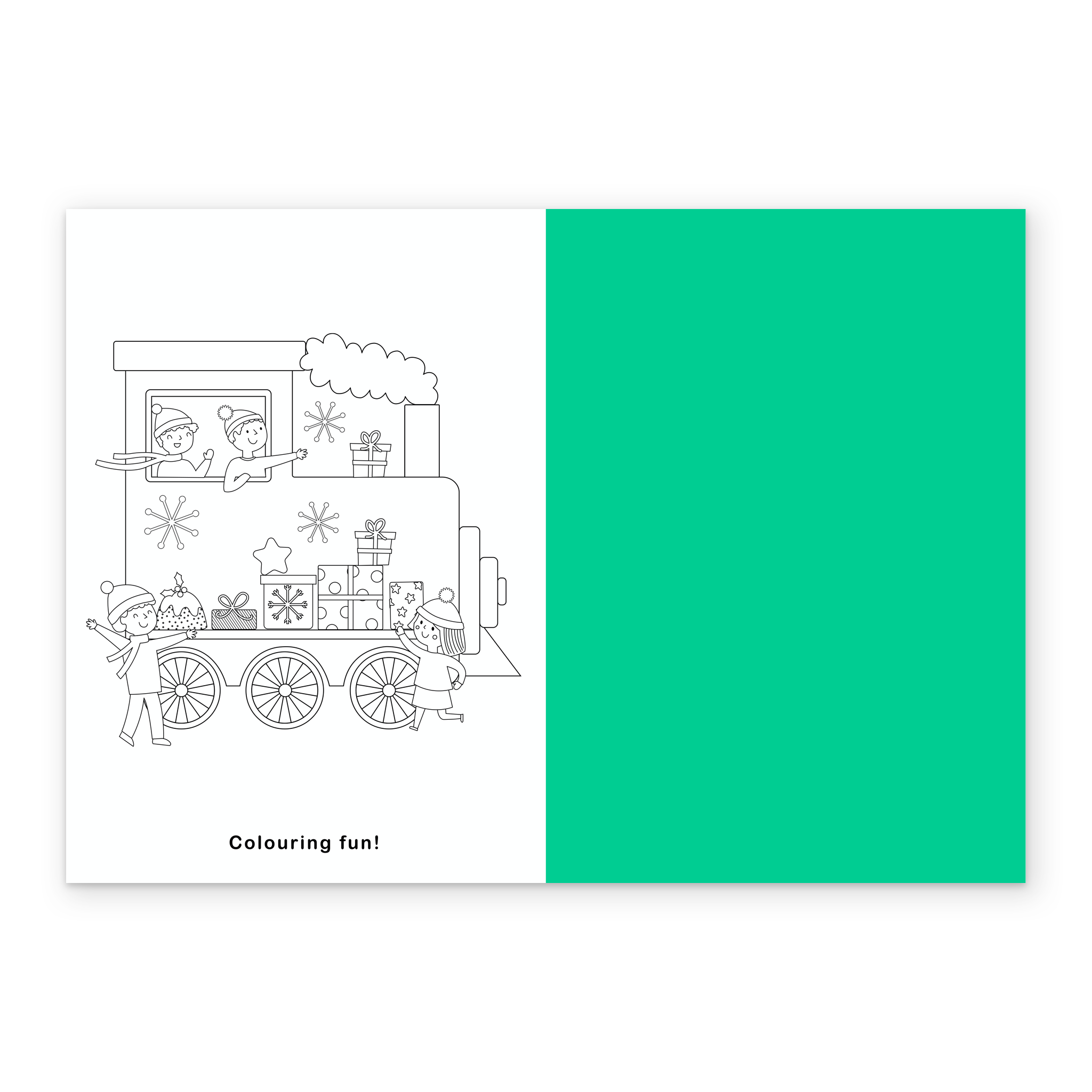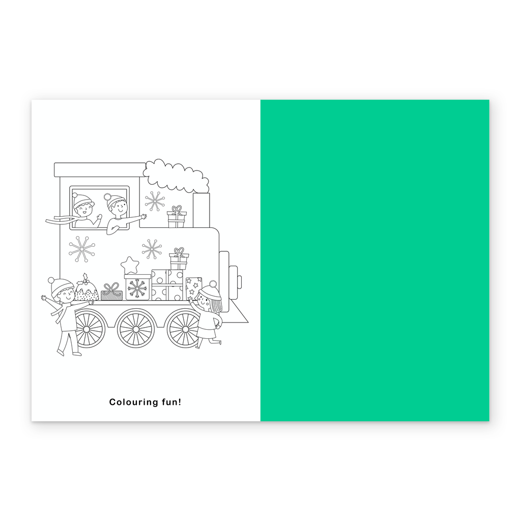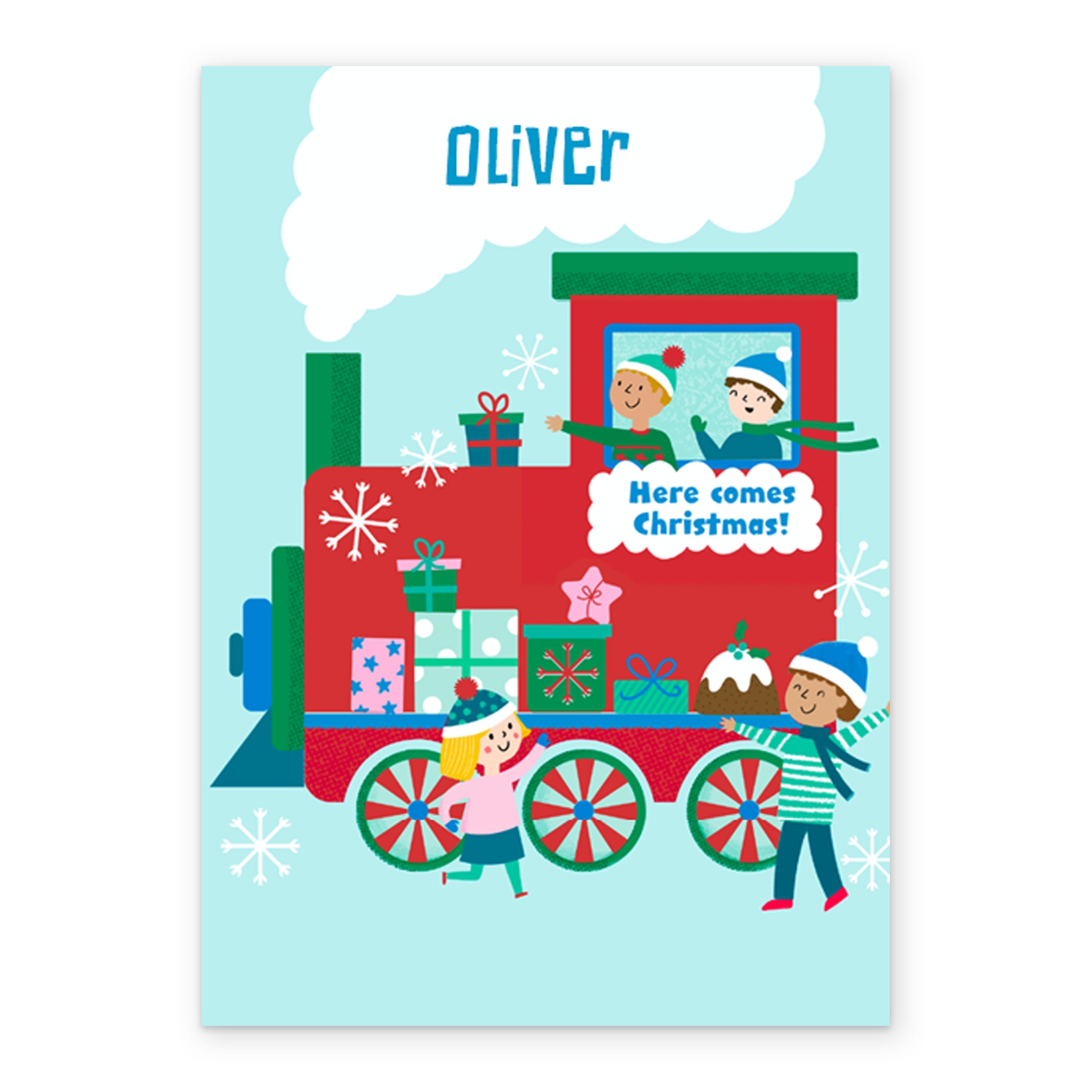 Printed on premium-quality board, this card features an illustrated red Christmas stream train, with space for a personalised name in the steam cloud, and the message 'Here comes Christmas!', inside is a colouring-in activity.