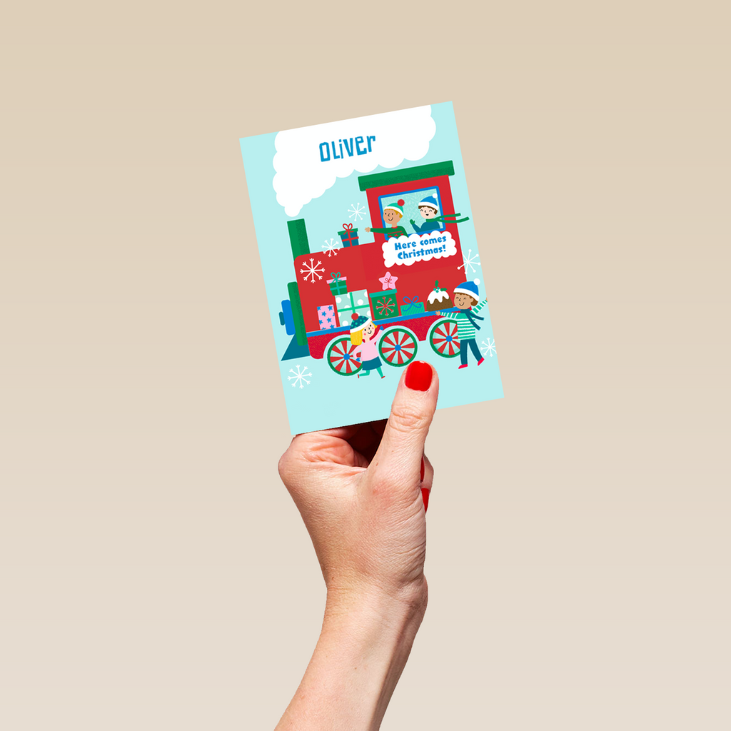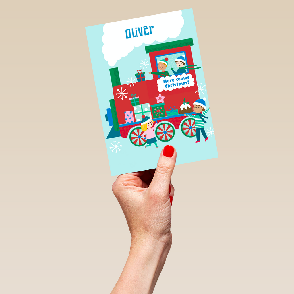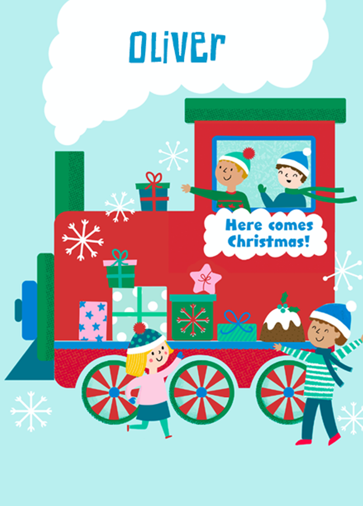Printed on premium-quality board, this card features an illustrated red Christmas stream train, with space for a personalised name in the steam cloud, and the message 'Here comes Christmas!', inside is a colouring-in activity.