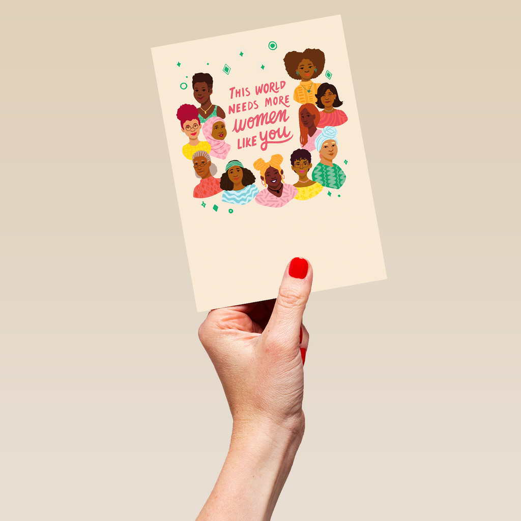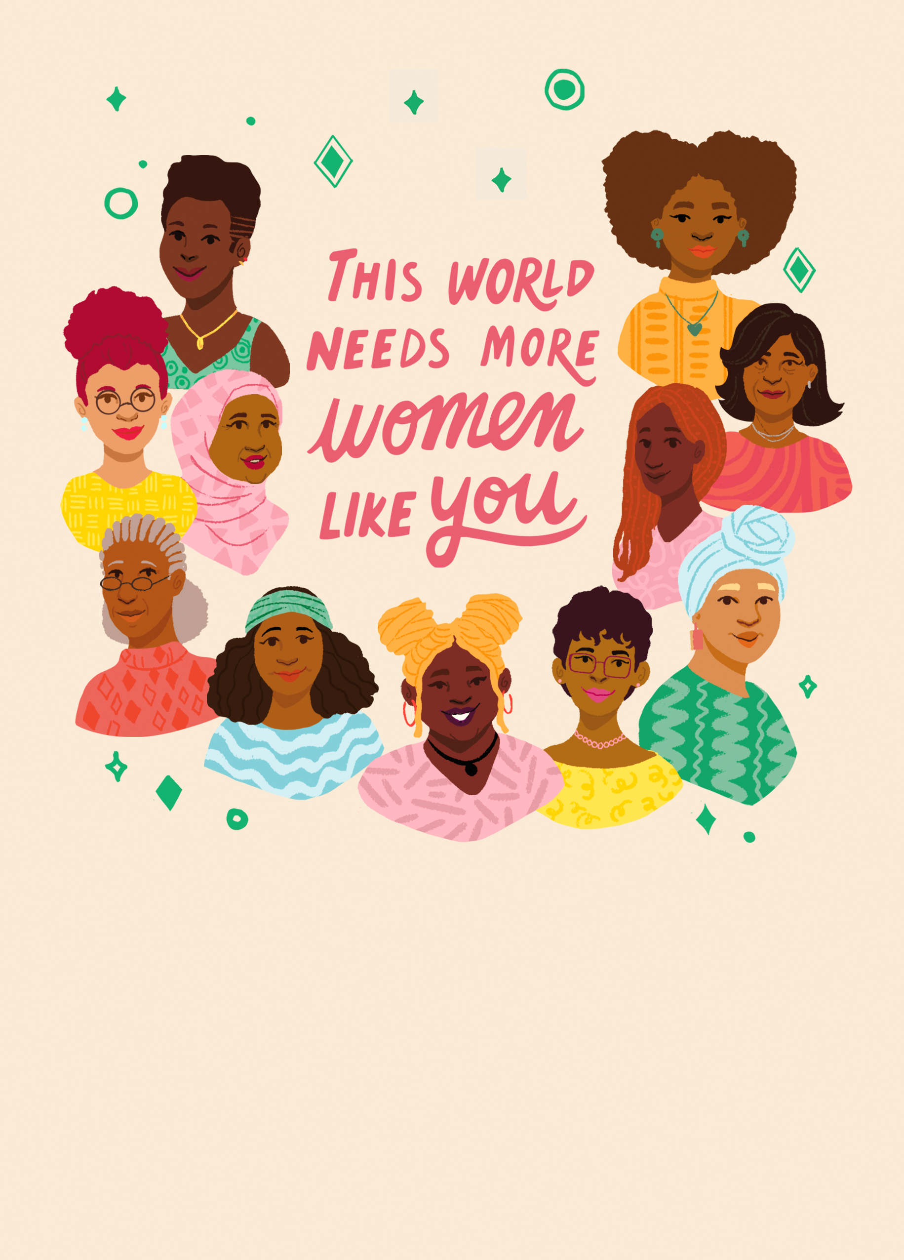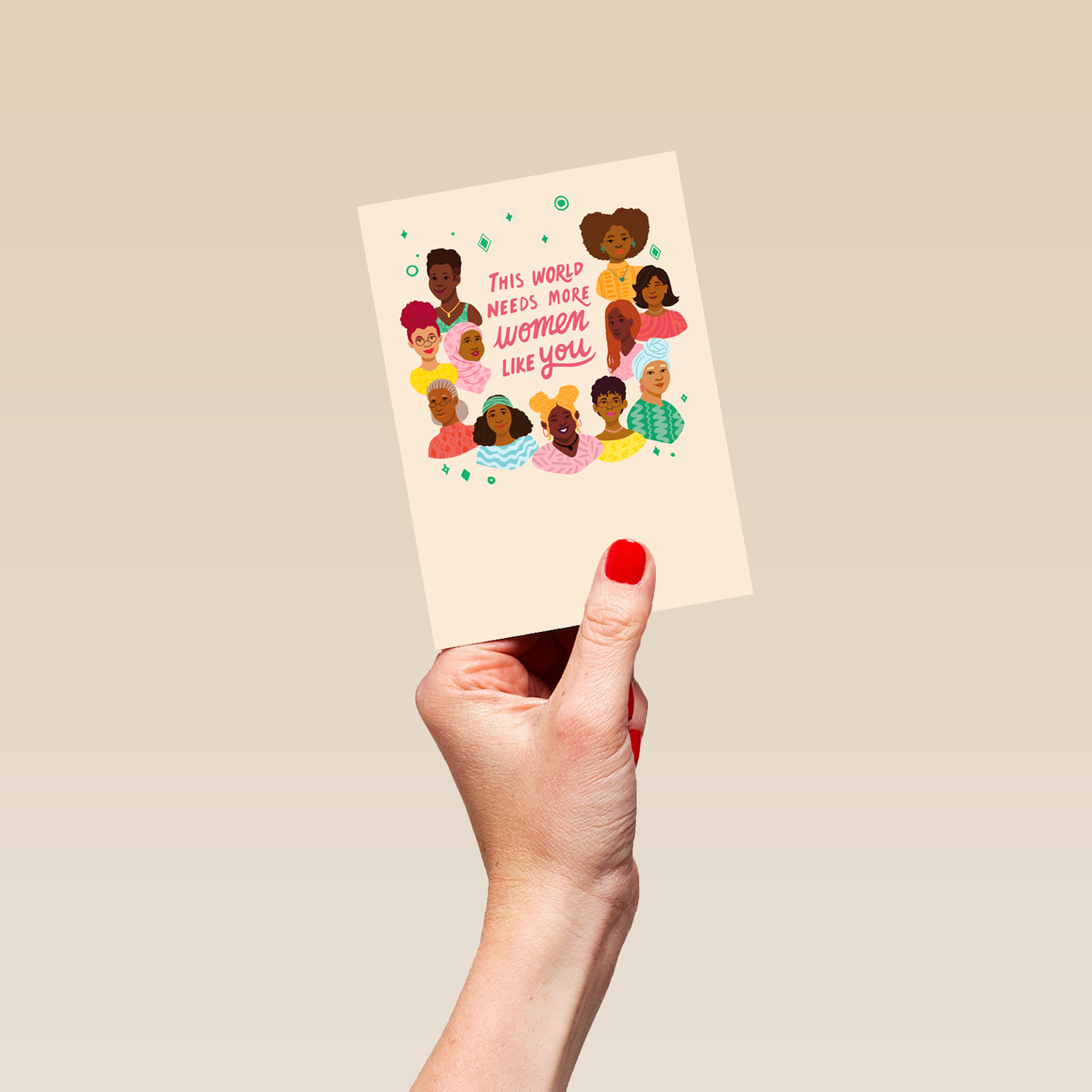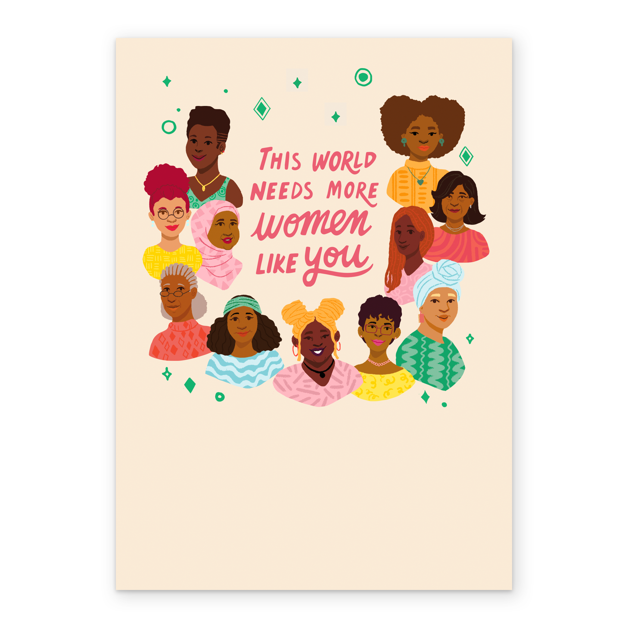 Printed on premium-quality board, this card features an illustration women, with the message 'This world needs more women like you', and comes complete with a co-ordinating white envelope.