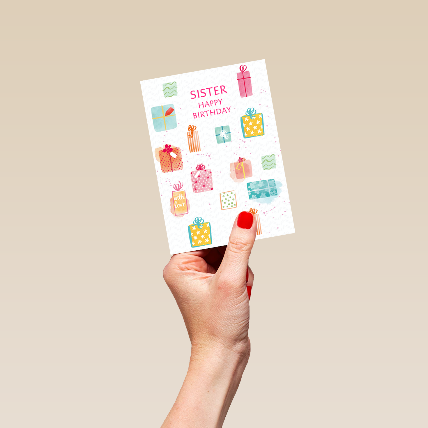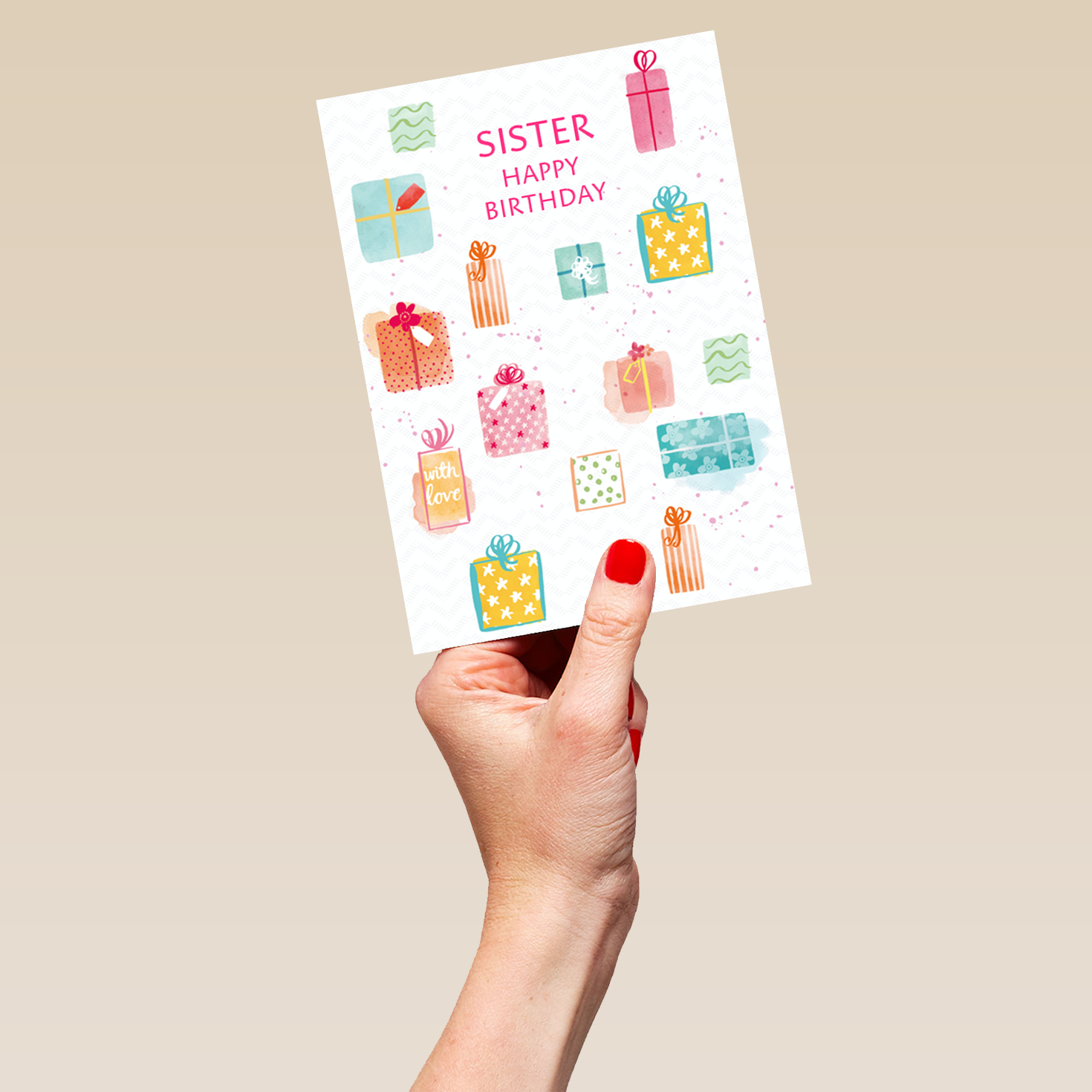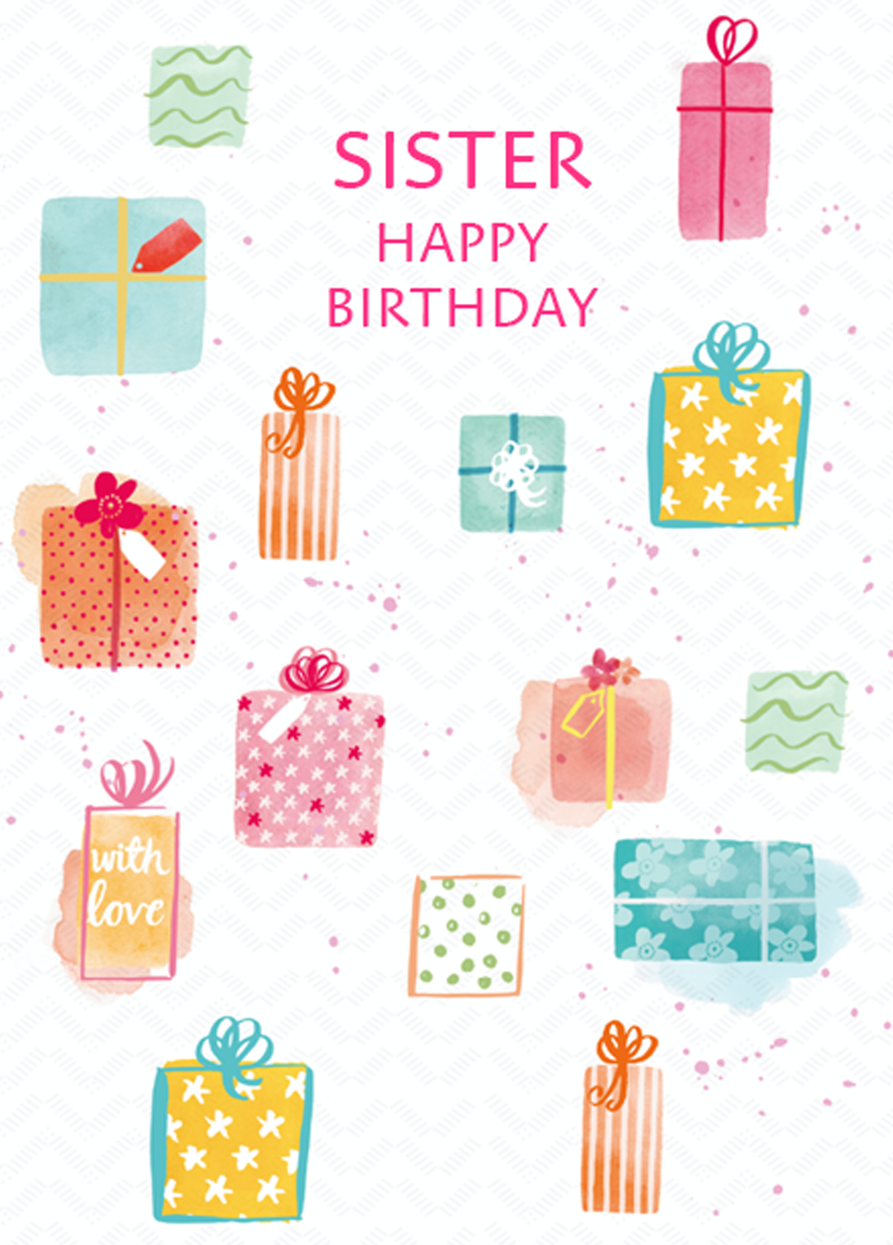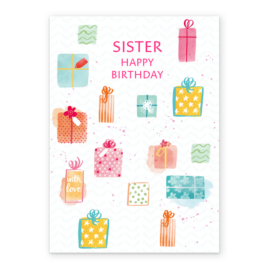 Show them you care with a personalised wrapped gifts sister birthday card from Hallmark. Our birthday cards are printed on premium quality, FSC®-certified card & delivered nationwide. This card is available as standard 12cm by 16.7cm and large 15.5cm by 21.6cm.
