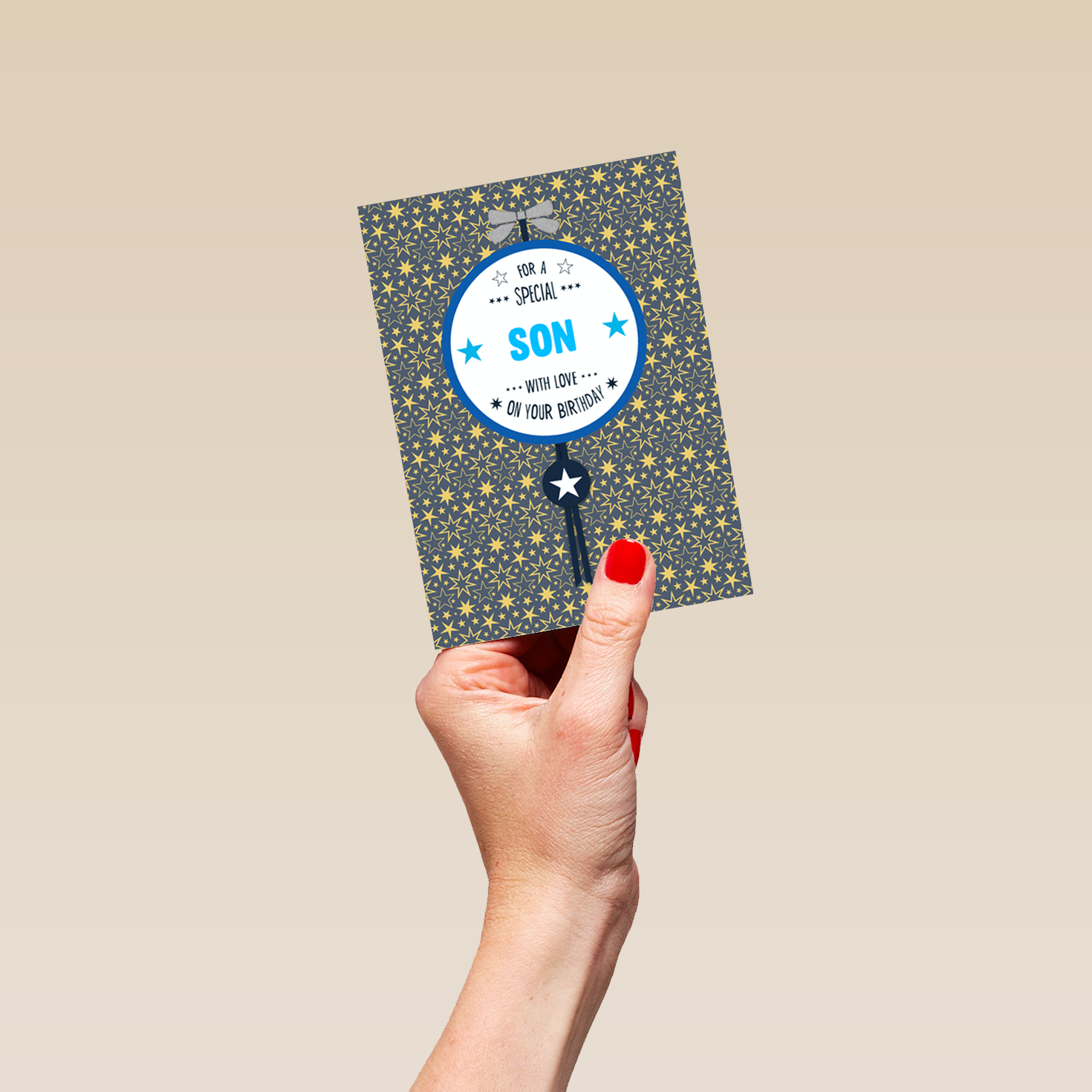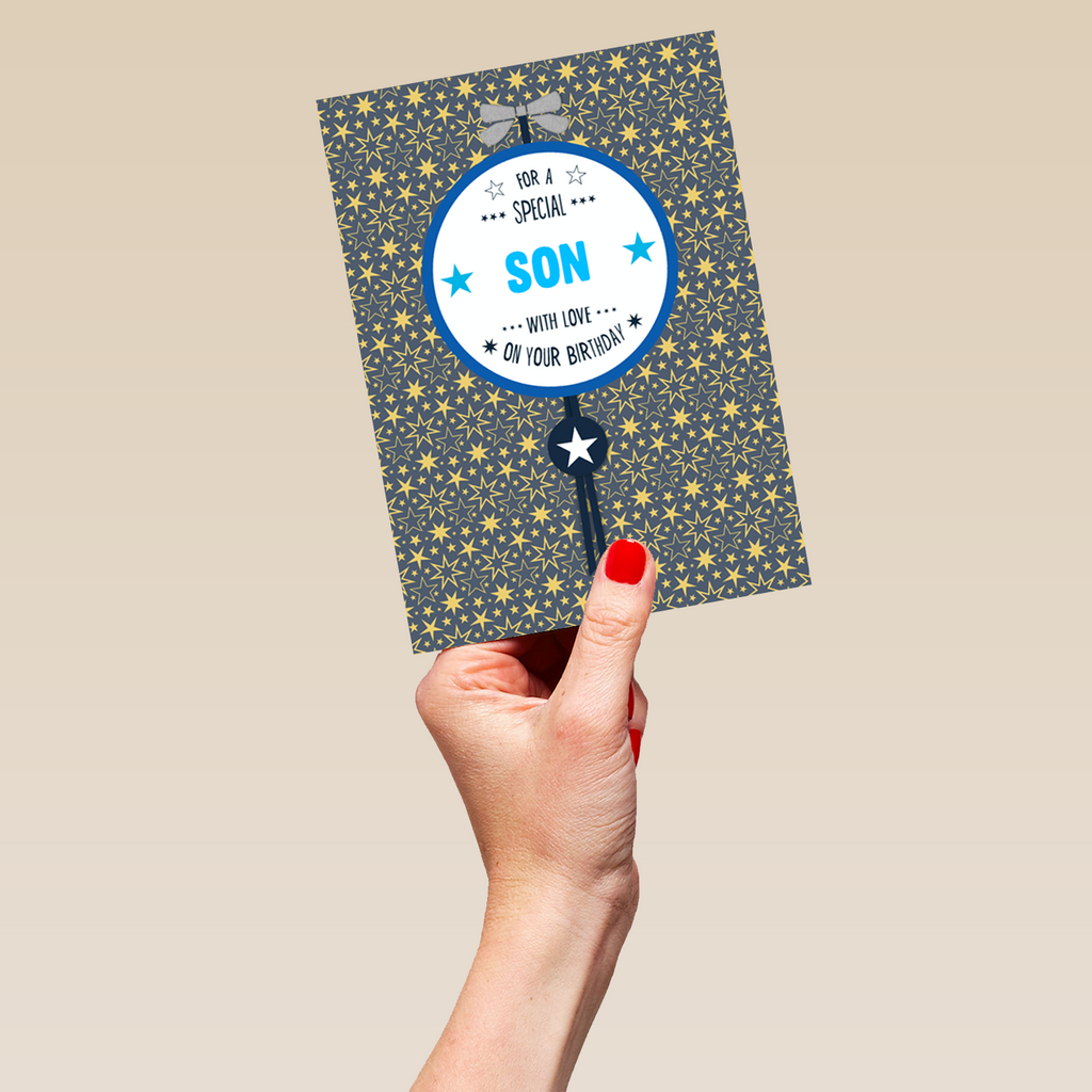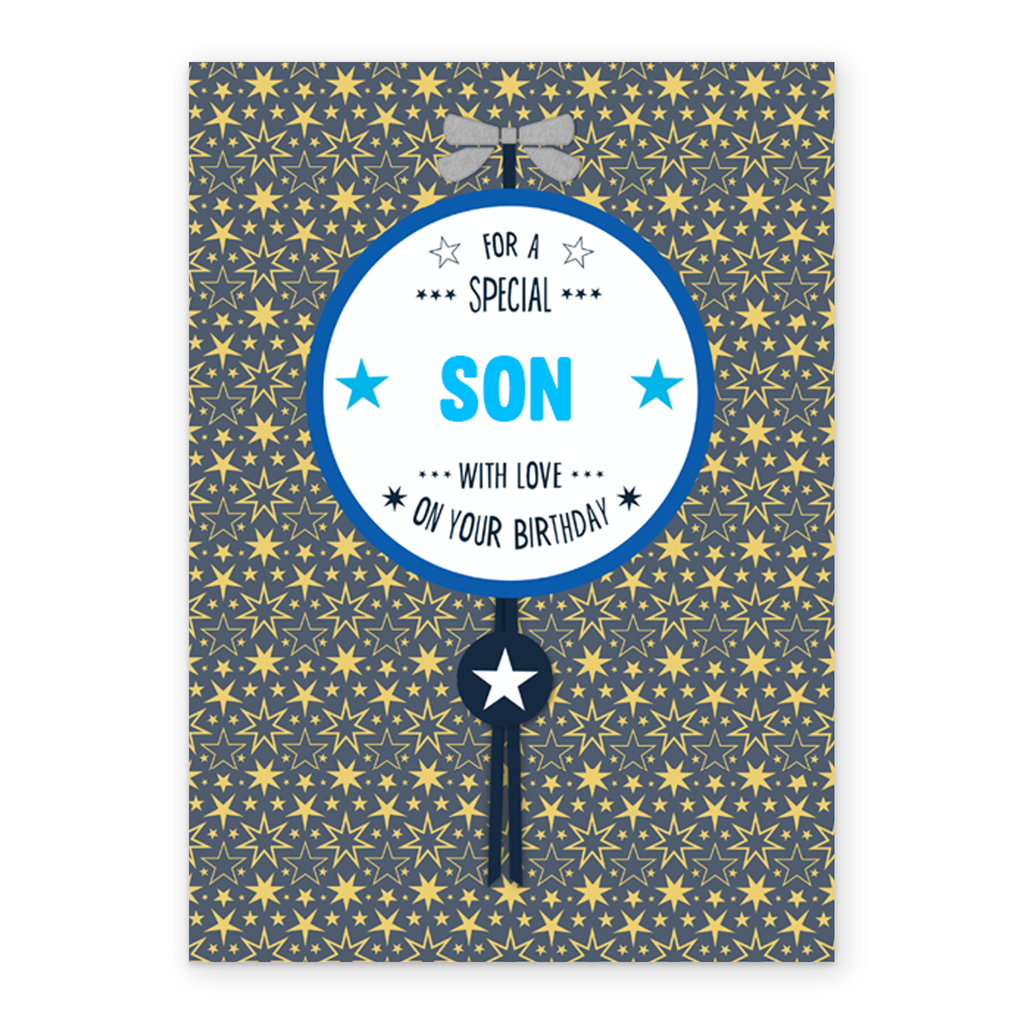 Show them you care with a personalised wrapped present son birthday card from Hallmark. Our birthday cards are printed on premium quality, FSC®-certified card & delivered nationwide. This card is available as standard 12cm by 16.7cm and large 15.5cm by 21.6cm.