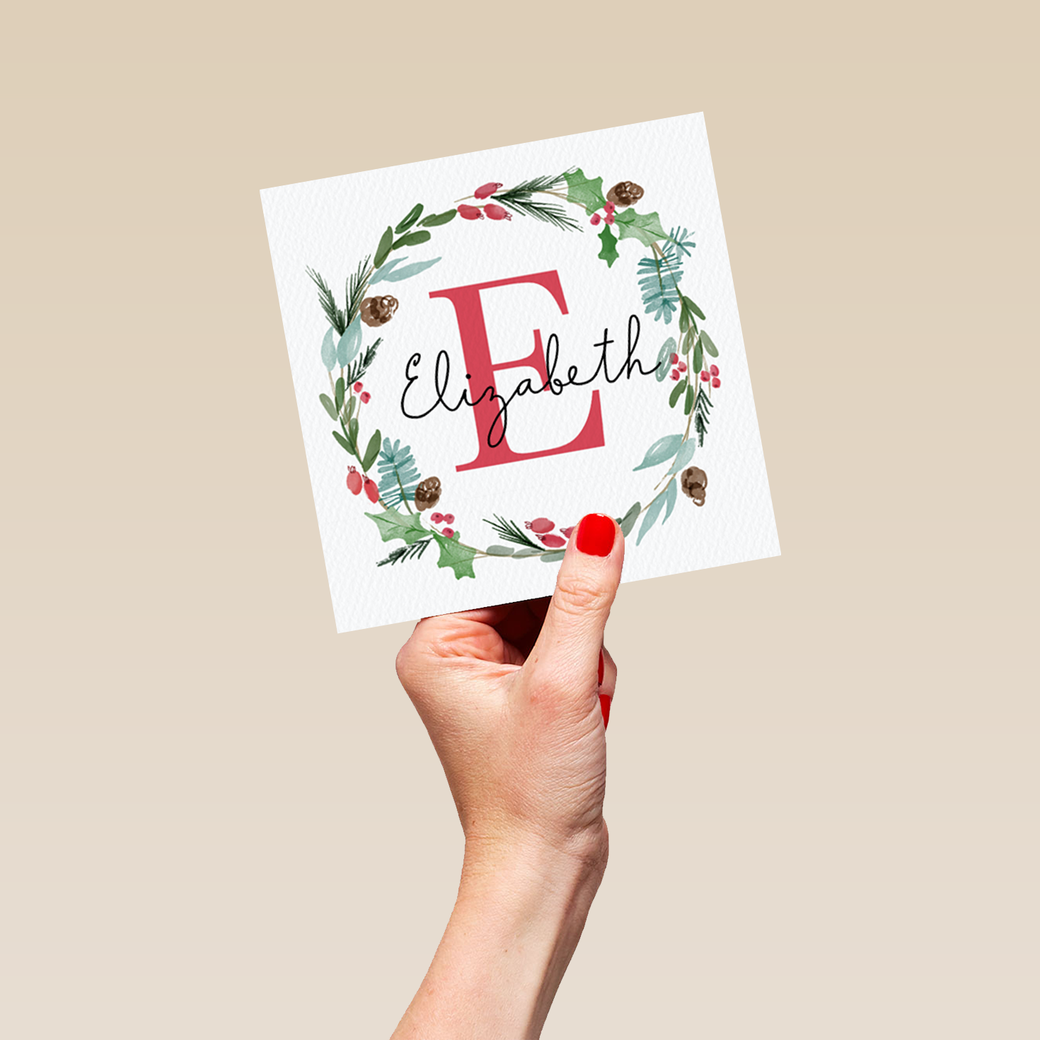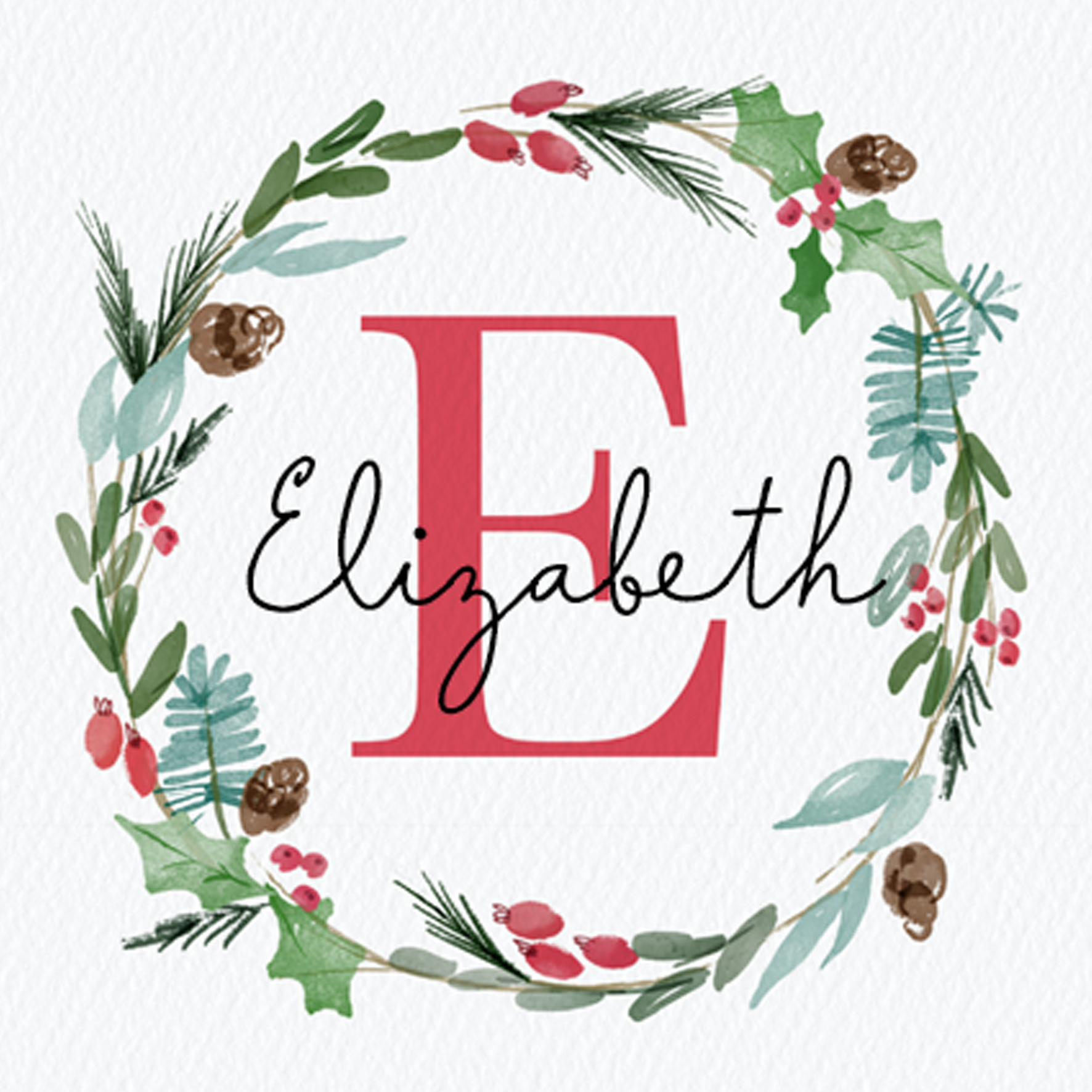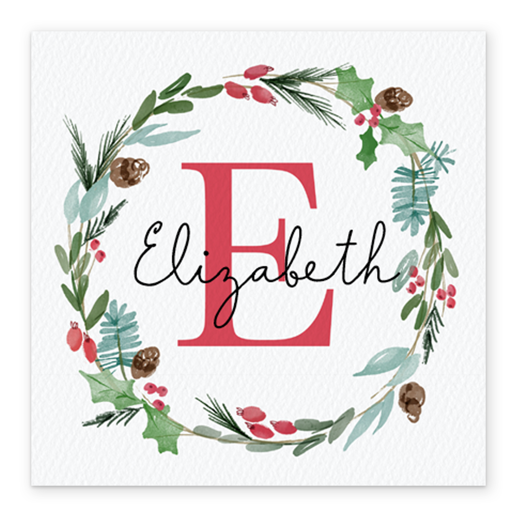 Show them you care with a personalised wreath monogram letter E Christmas card from Hallmark. Our greetings cards are printed on premium quality, FSC®-certified card & delivered nationwide. This card is available as standard 12cm by 12cm and large 15cm by 15cm.