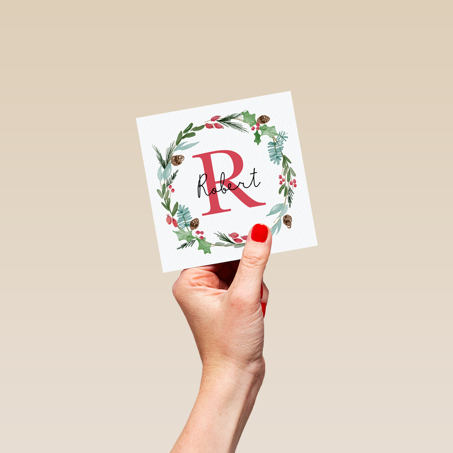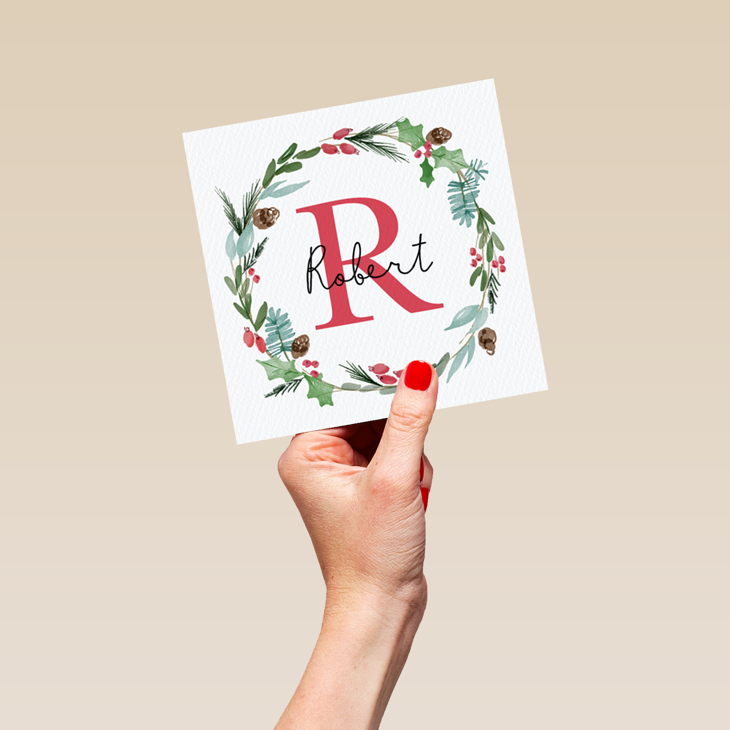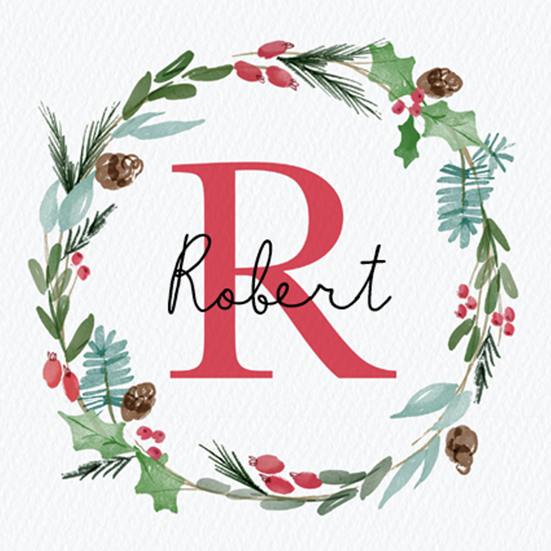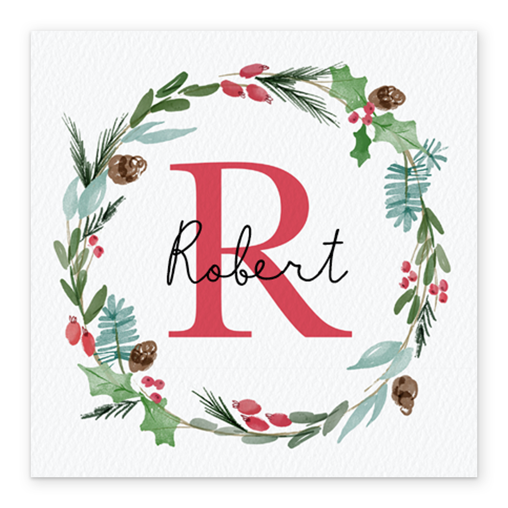 Show them you care with a personalised wreath monogram letter R Christmas card from Hallmark. Our greetings cards are printed on premium quality, FSC®-certified card & delivered nationwide. This card is available as standard 12cm by 12cm and large 15cm by 15cm.
