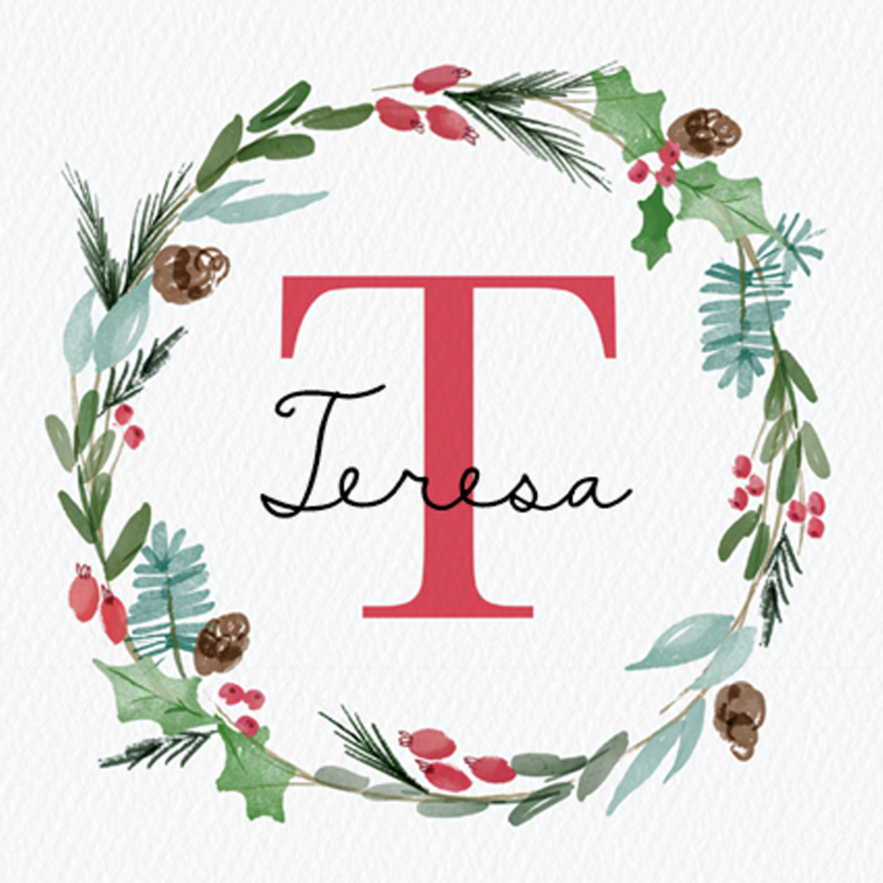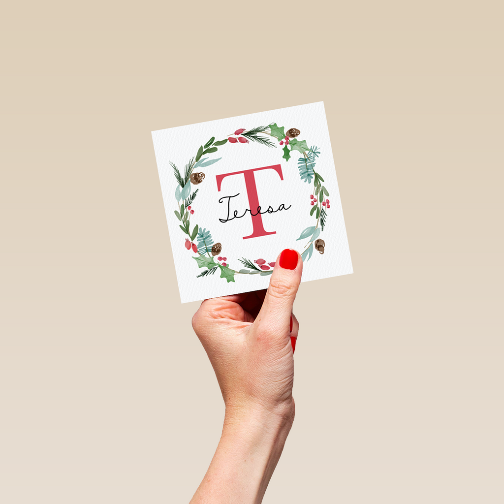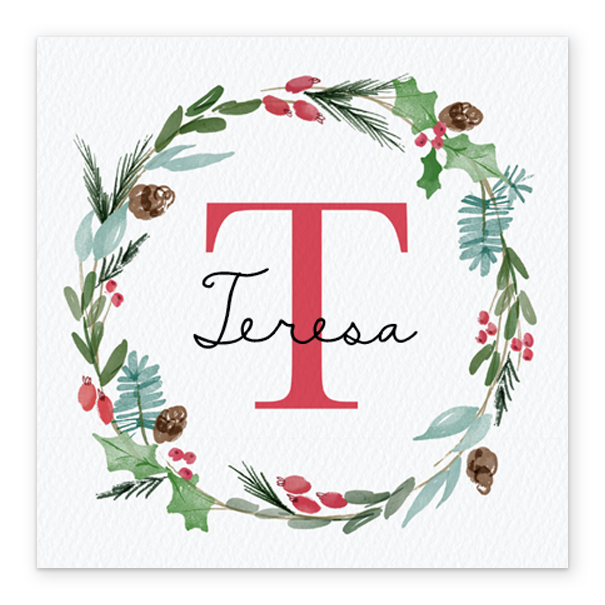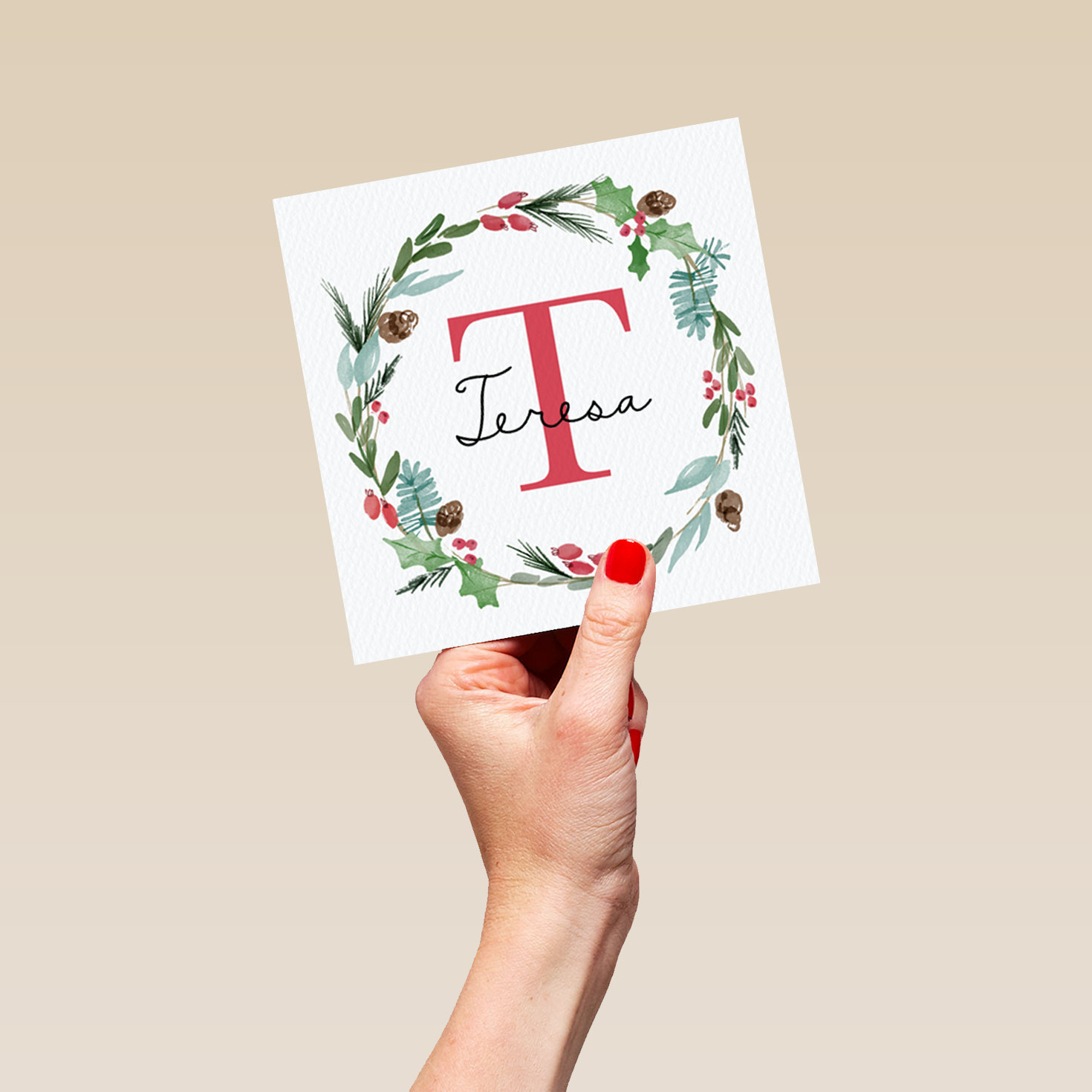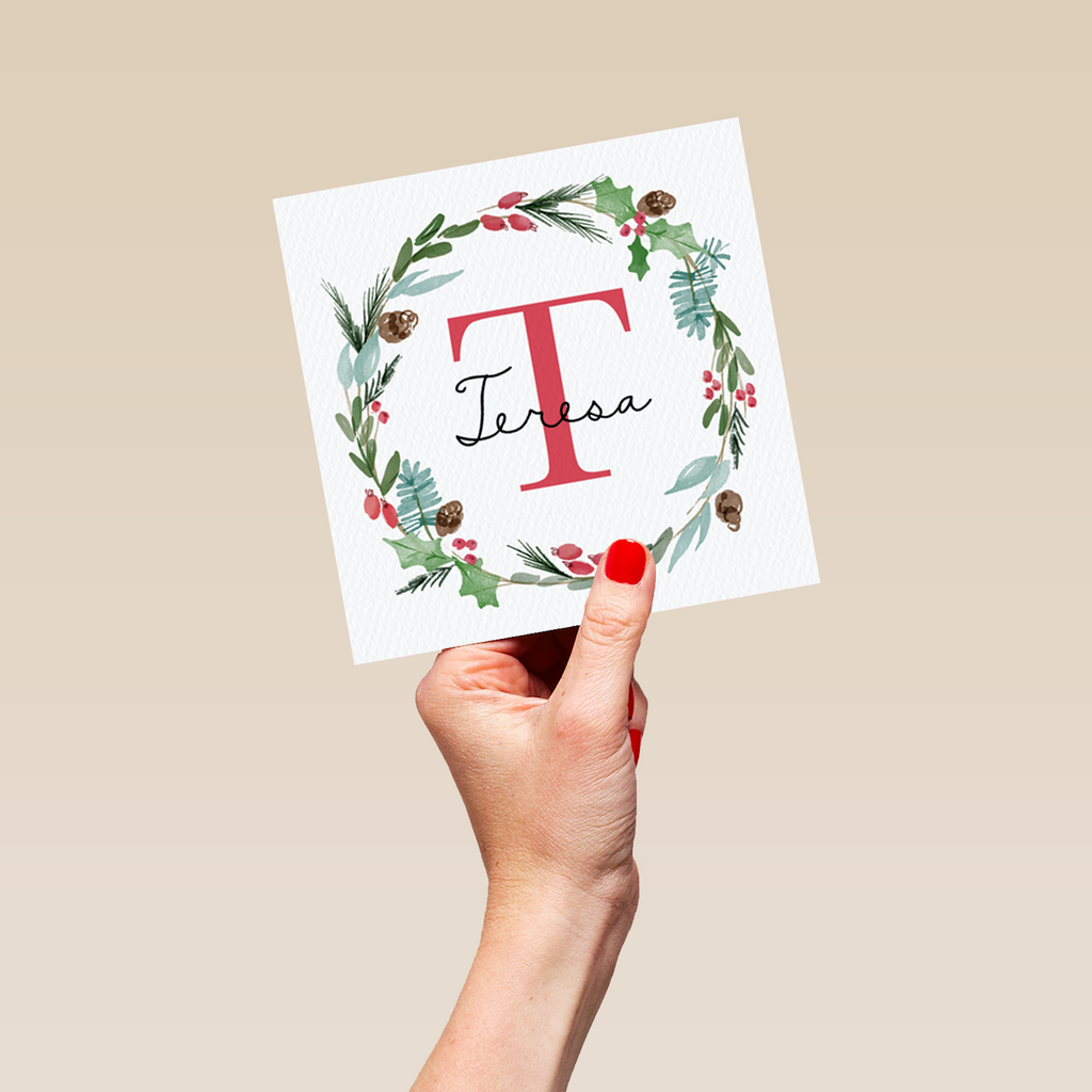Show them you care with a personalised wreath monogram letter T Christmas card from Hallmark. Our greetings cards are printed on premium quality, FSC®-certified card & delivered nationwide. This card is available as standard 12cm by 12cm and large 15cm by 15cm.