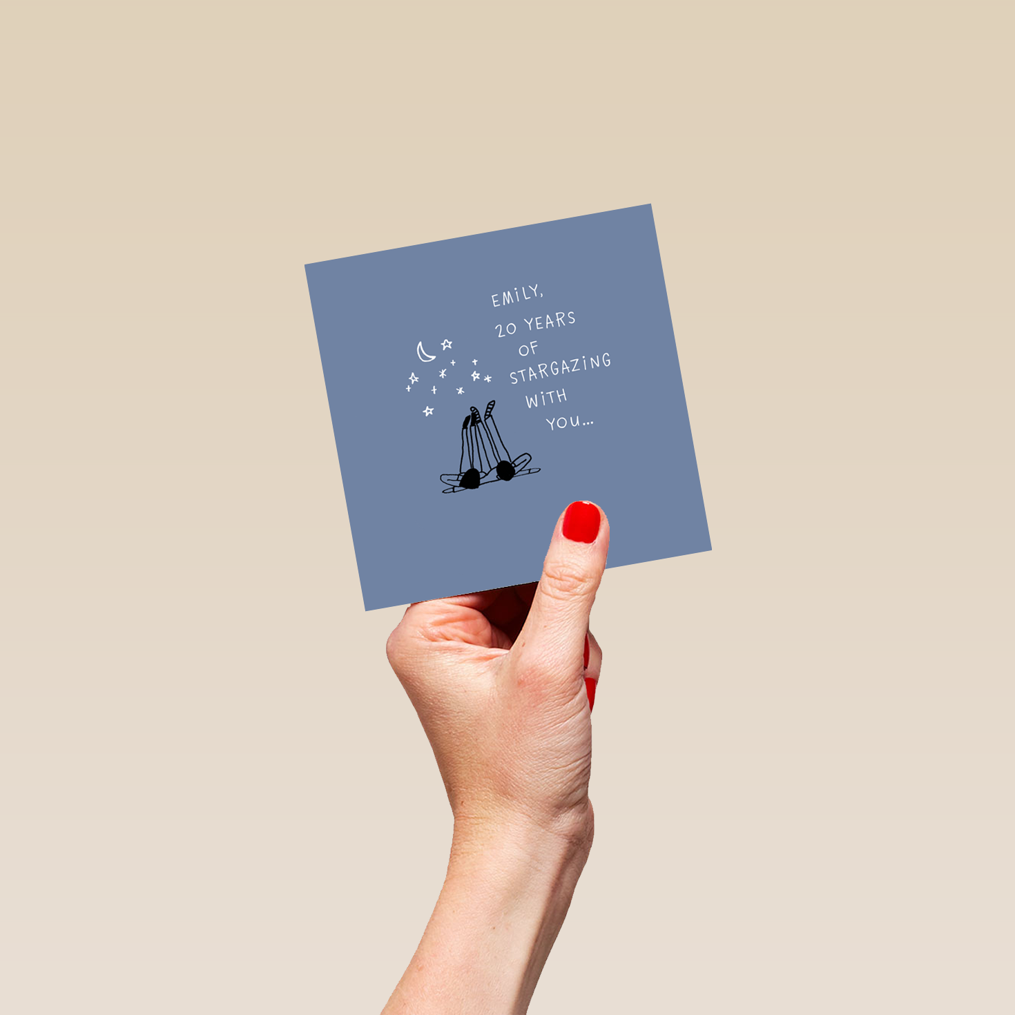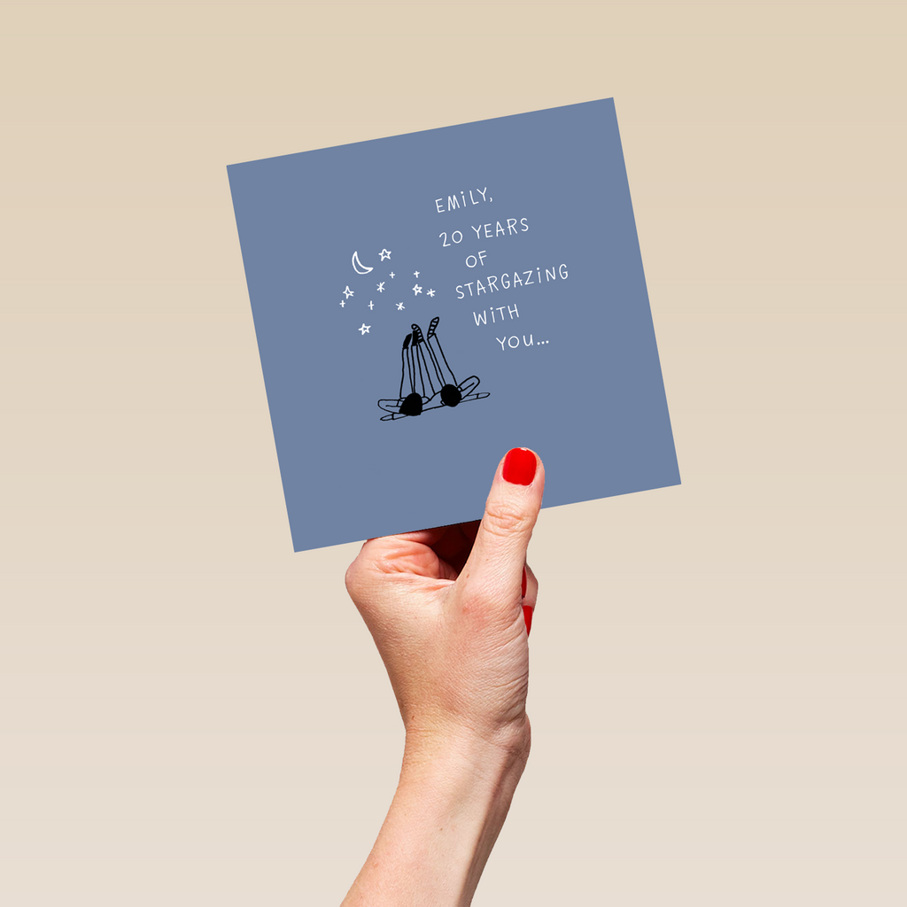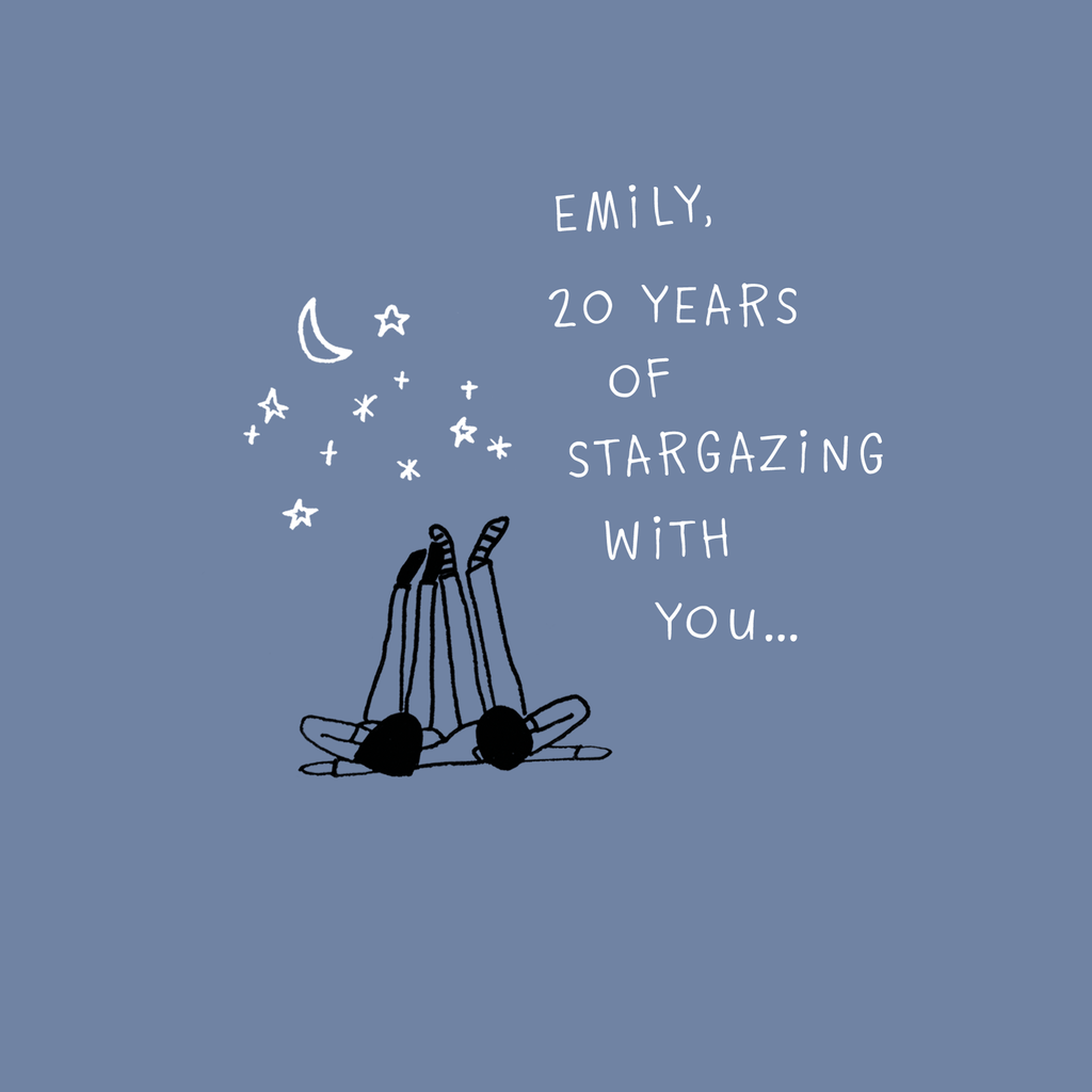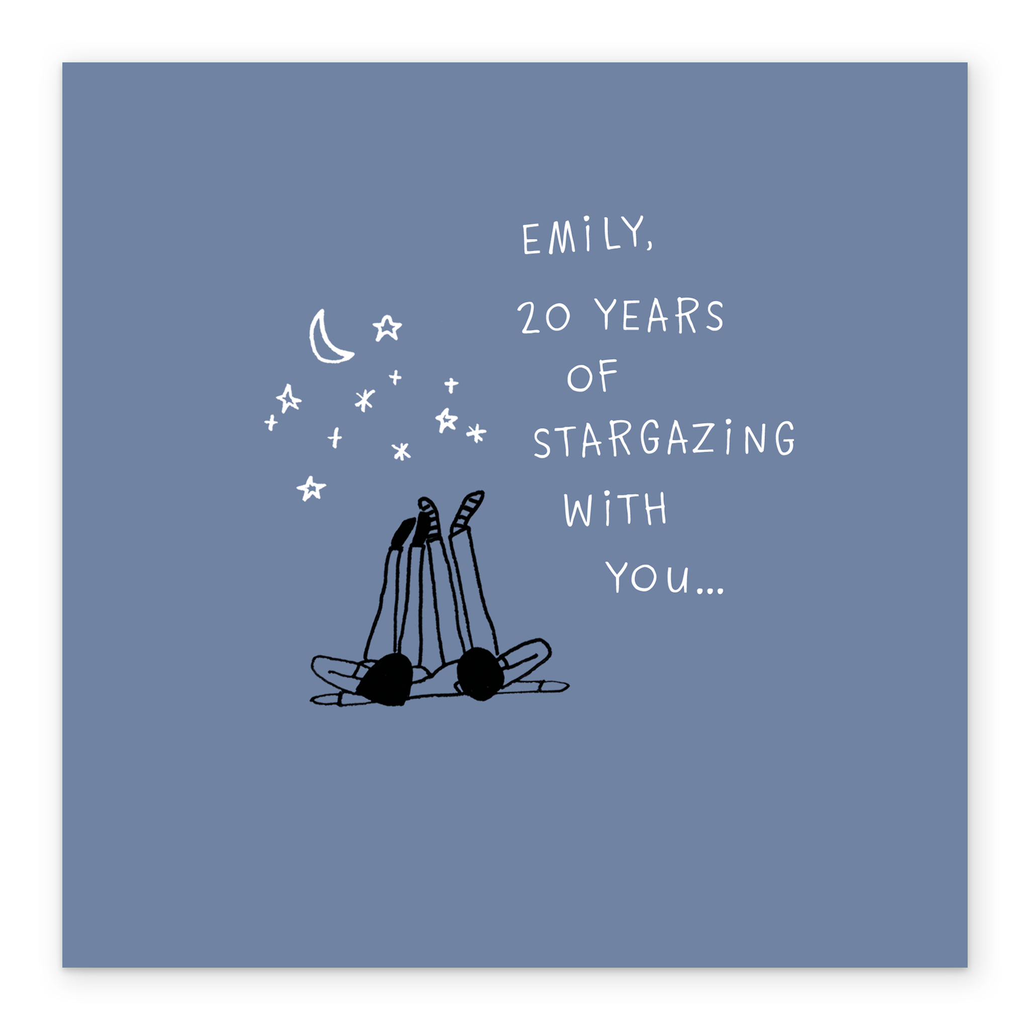Printed on premium-quality board, this card features a simple black and white design of a couple staring into a starry sky, on a blue background, with the message '20 years of stargazing with you…', space to personalise your message, and comes complete with a co-ordinating white envelope.