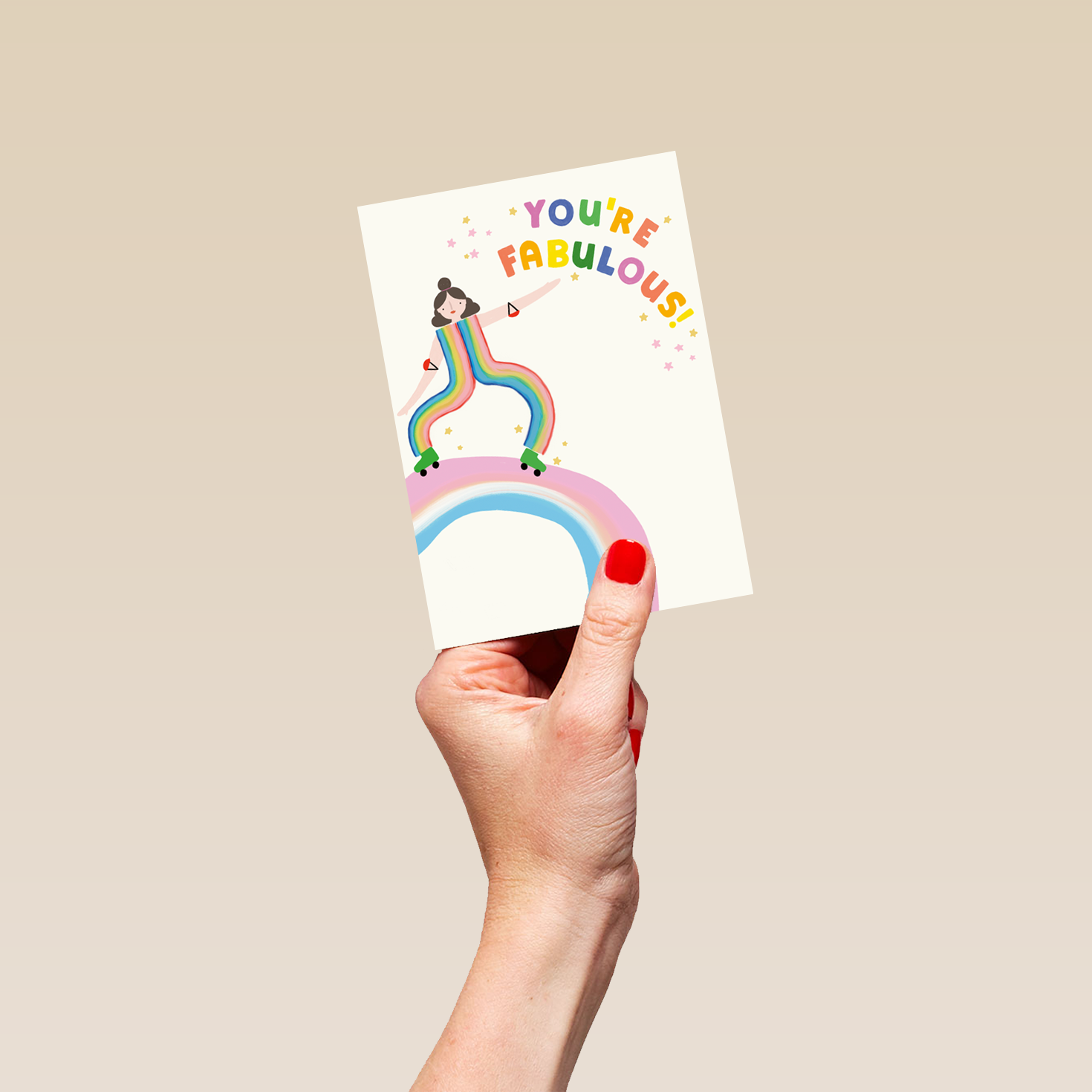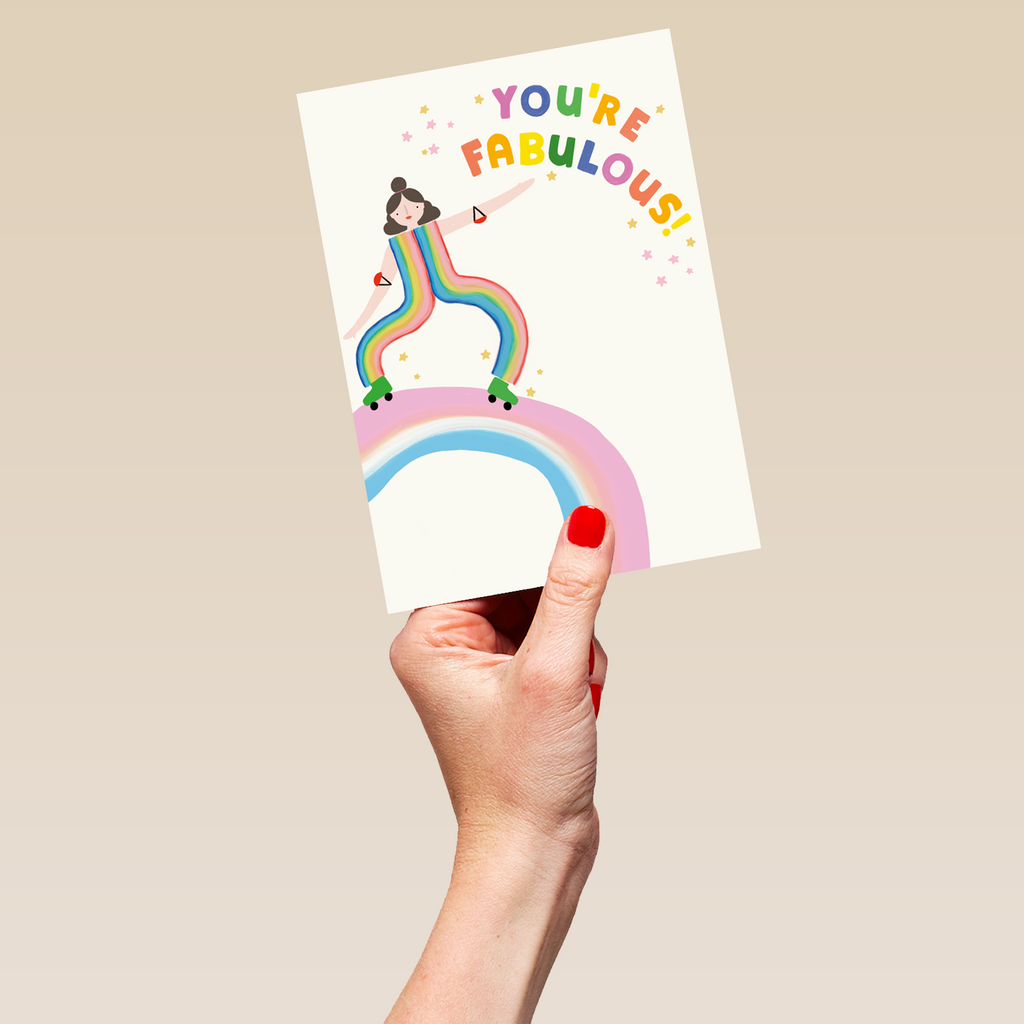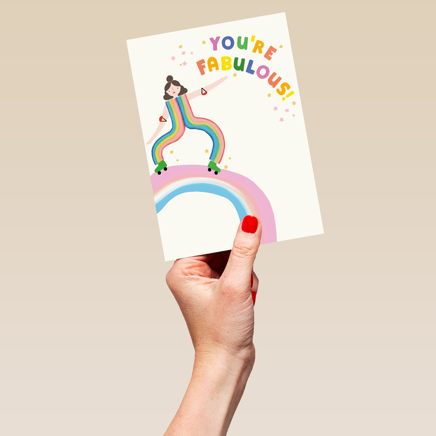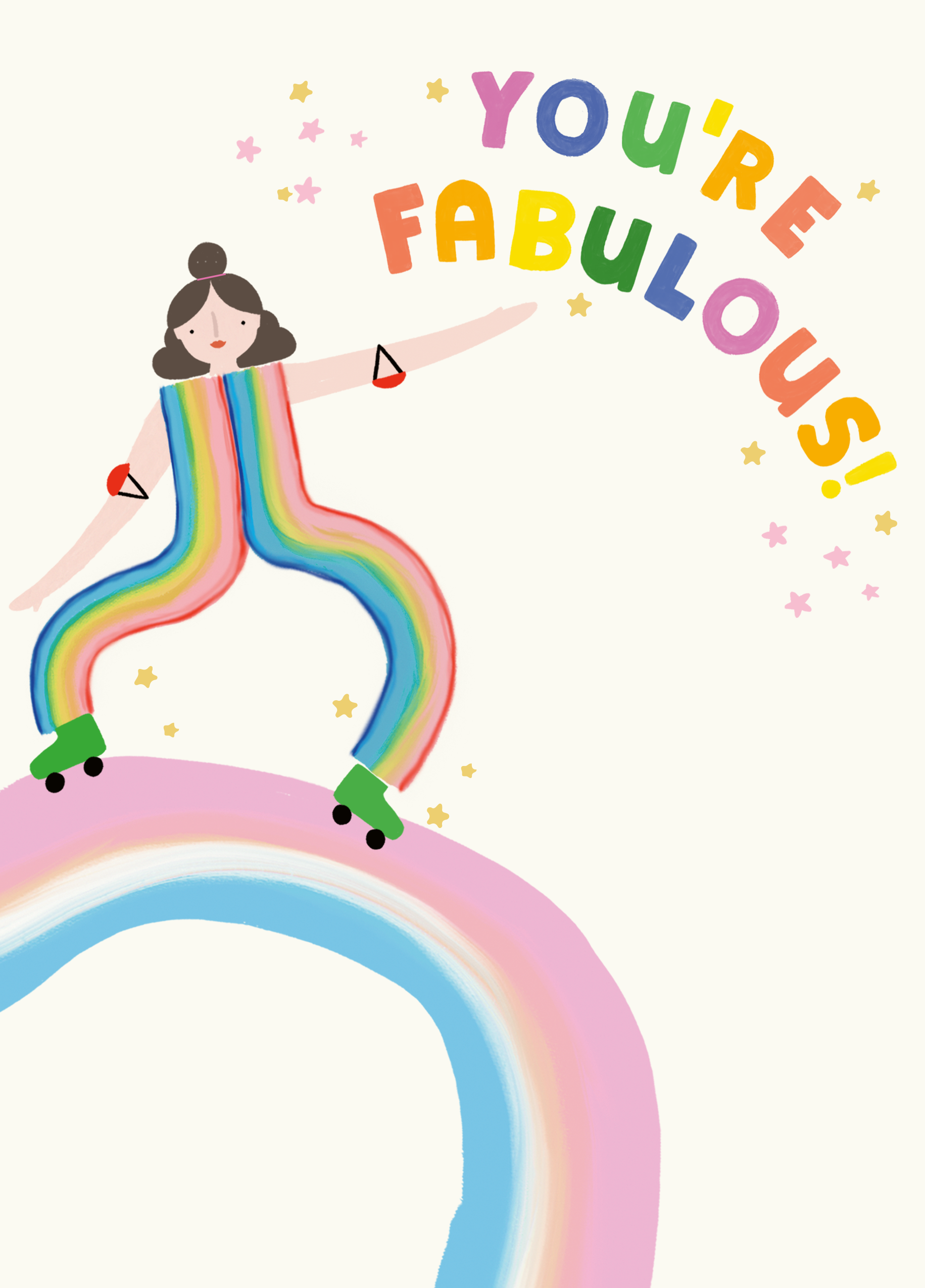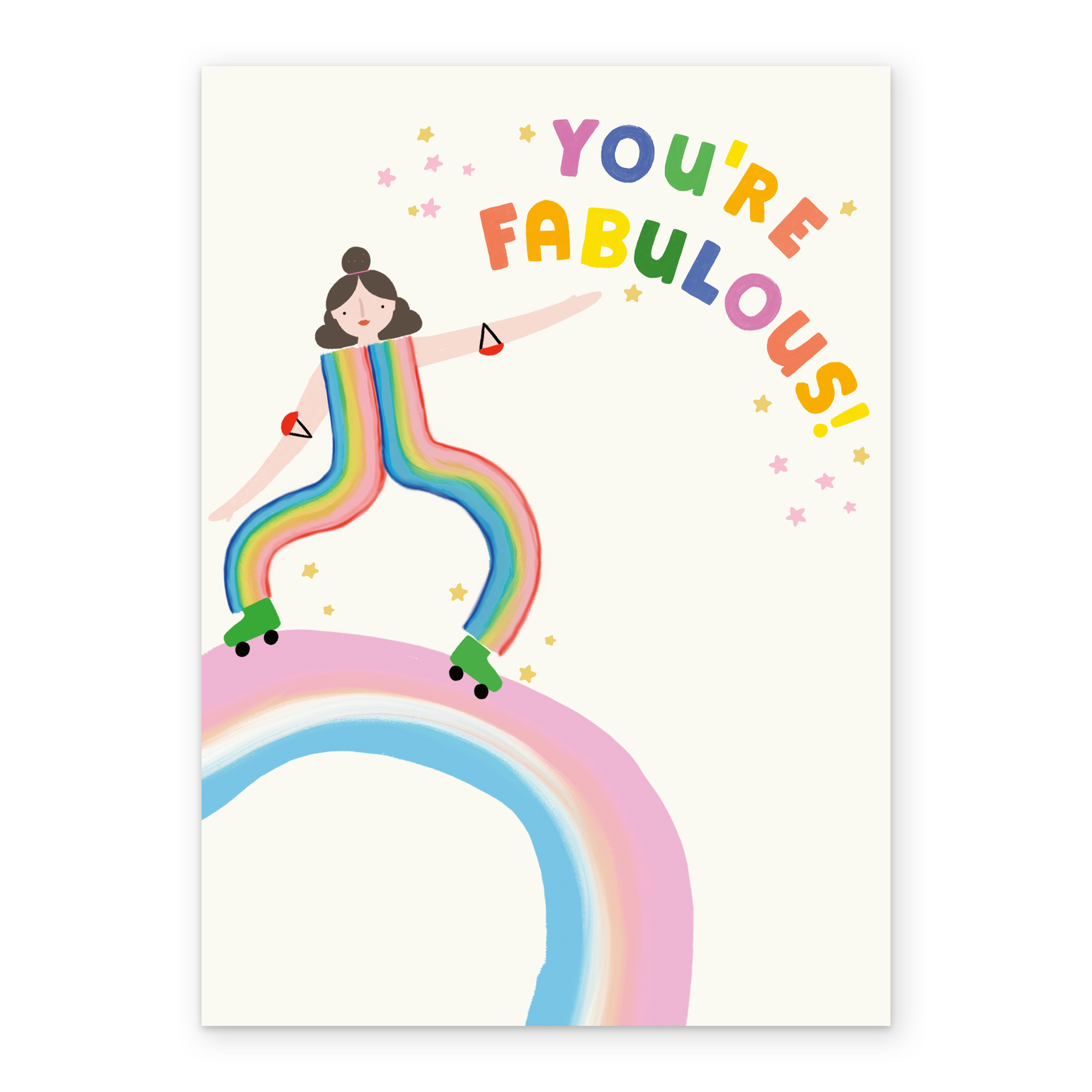Printed on premium-quality board, this card features fun multicoloured text, an illustrated roller-skating girl, stars and a rainbow, with the message 'You're Fabulous!', and comes complete with a co-ordinating white envelope.