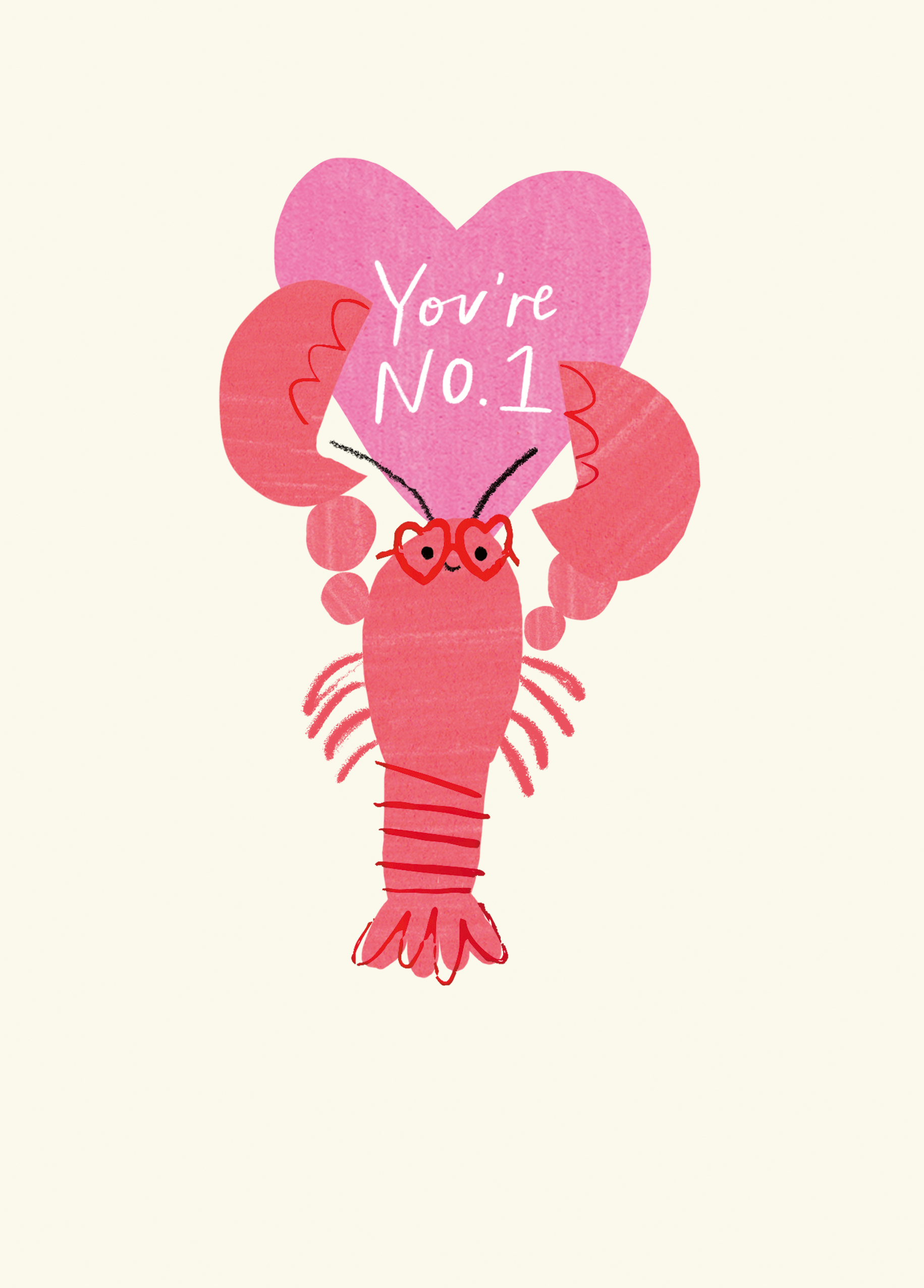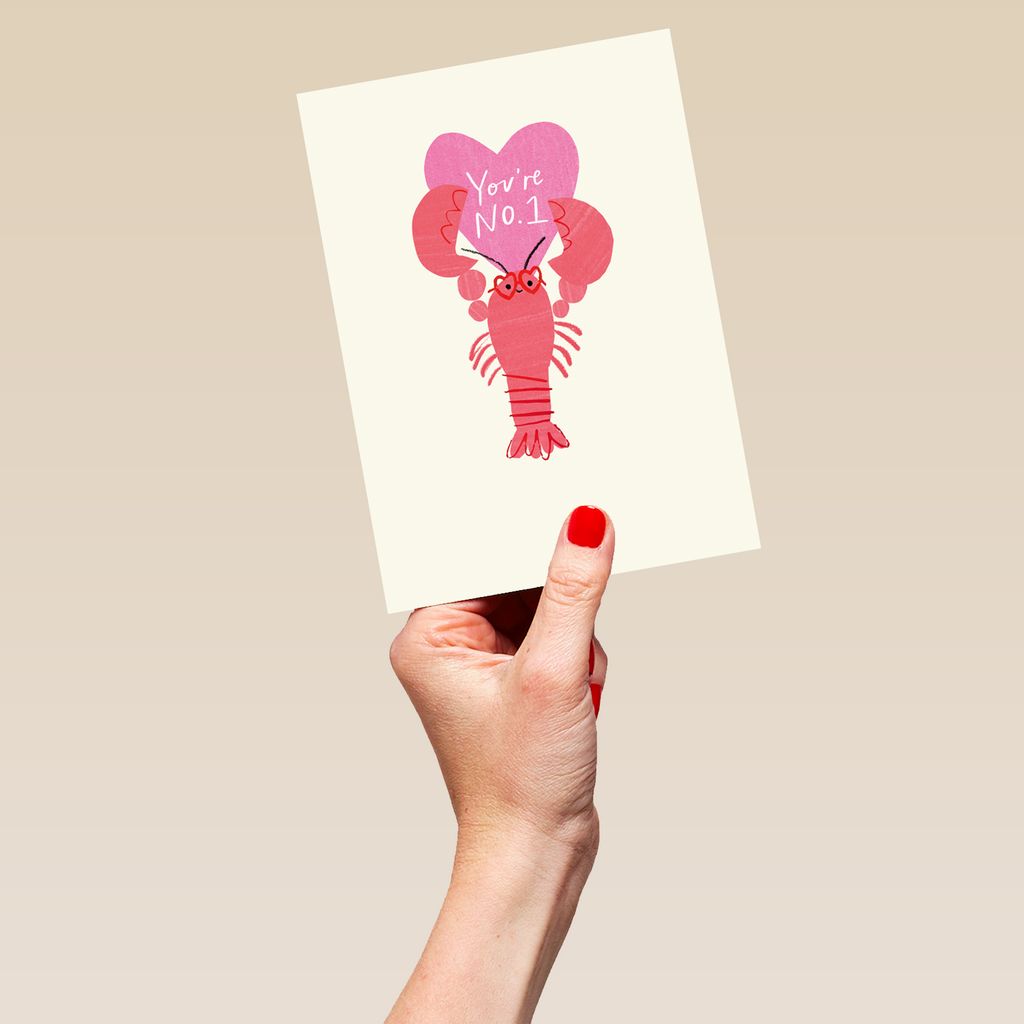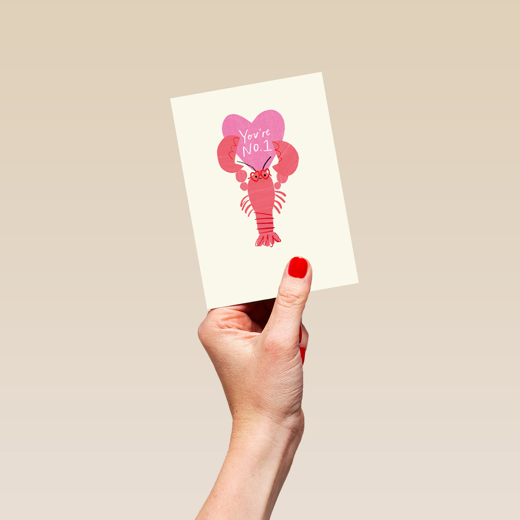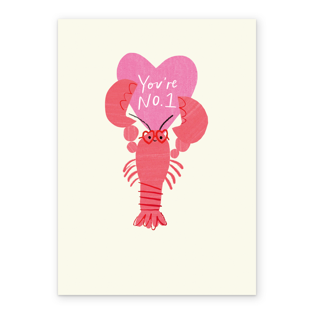 Printed on premium-quality board, this card features a lobster wearing heart-shaped glasses and holding a pink heart, with the message 'You're No.1', and comes complete with a co-ordinating white envelope.