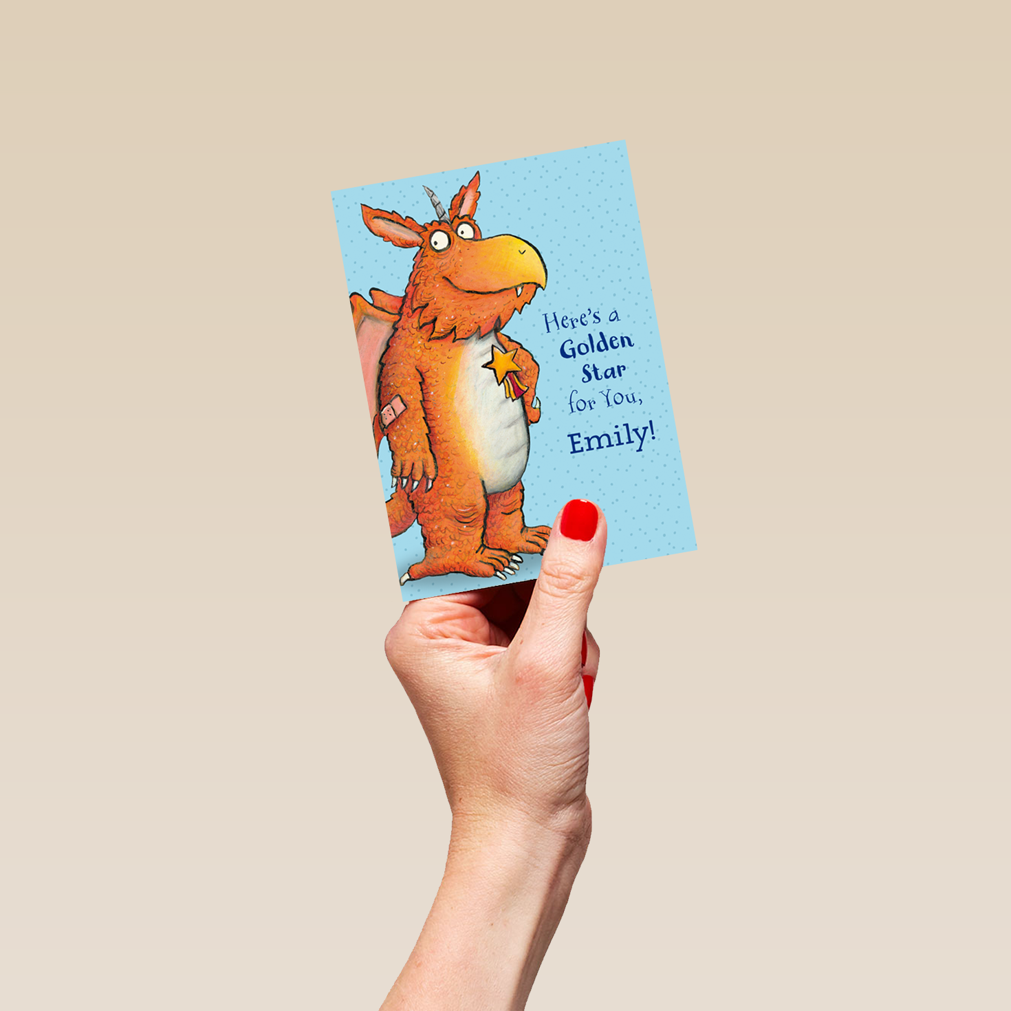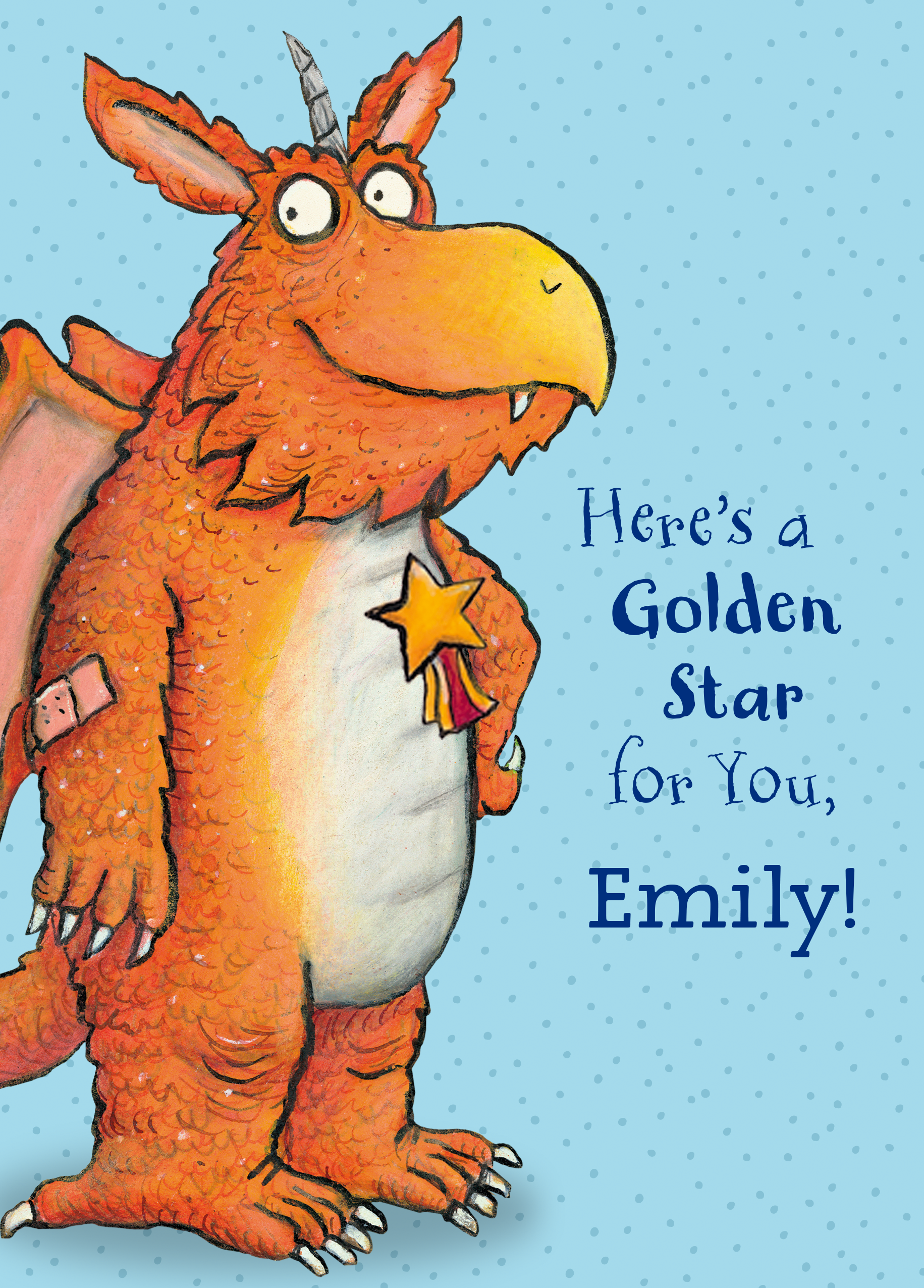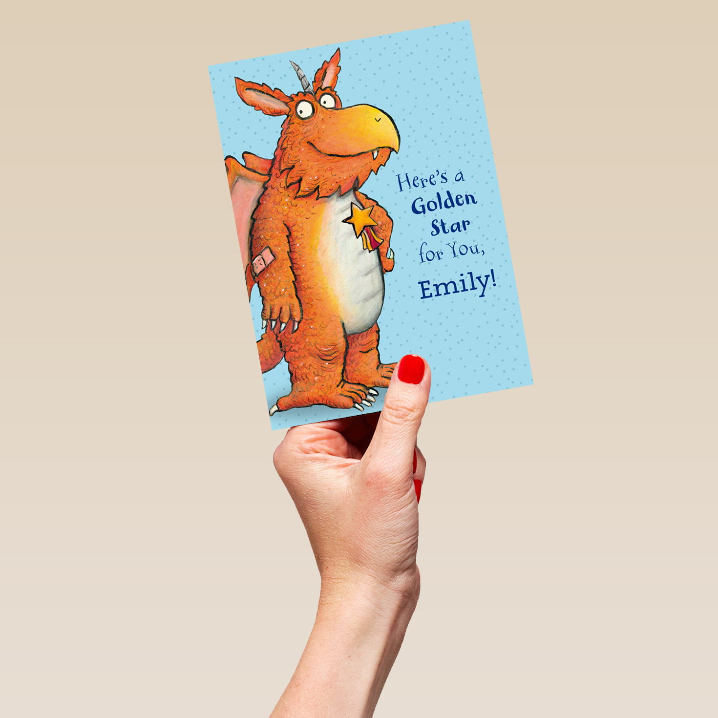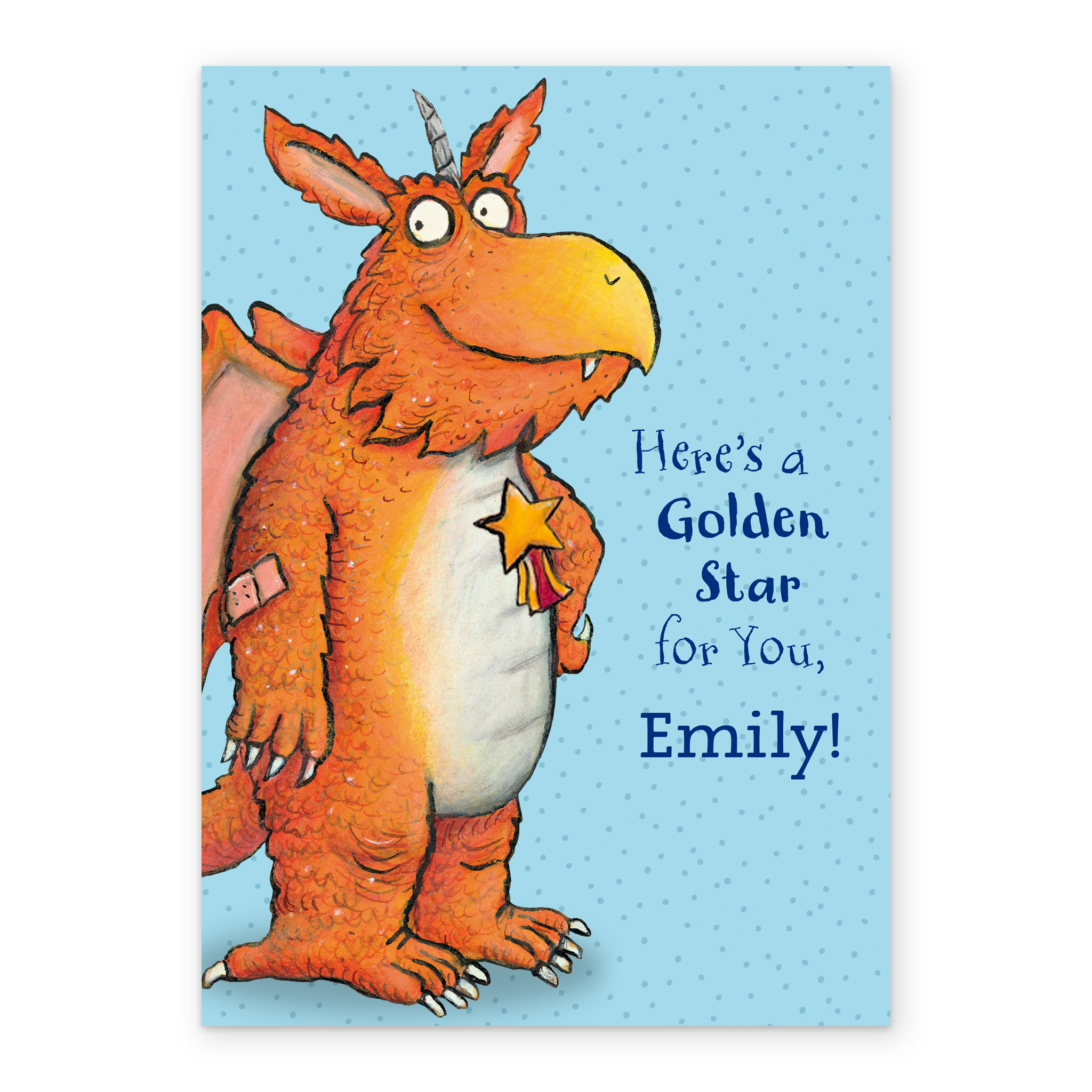 Printed on premium-quality board, this card features a classic Axel Schaeffler illustration of Julia Donaldson's Zog set against a pale blue background alongside black lettering, with the message 'Here's A Golden Star For You [NAME]!', space to personalise a name, and comes complete with a co-ordinating white envelope.