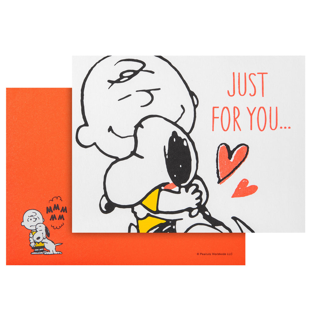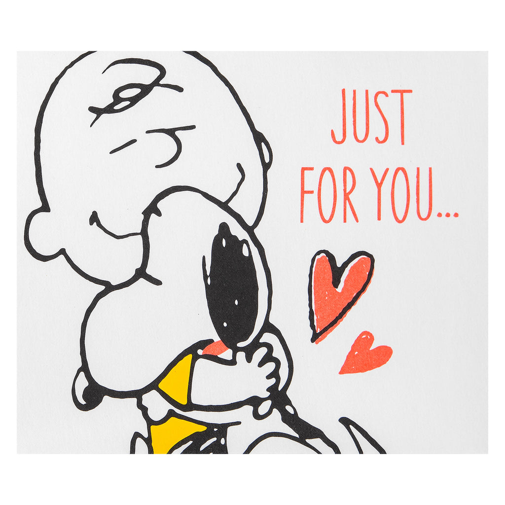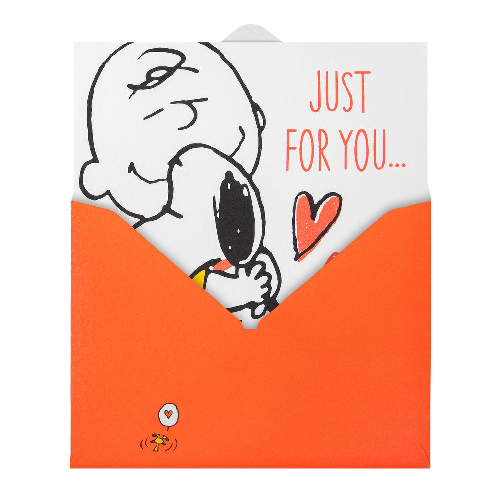 When opened this ‘Just For You’ card reveals a fun and charming SNOOPY & Charlie Brown scene. The card comes complete with a red Hallmark branded envelope.