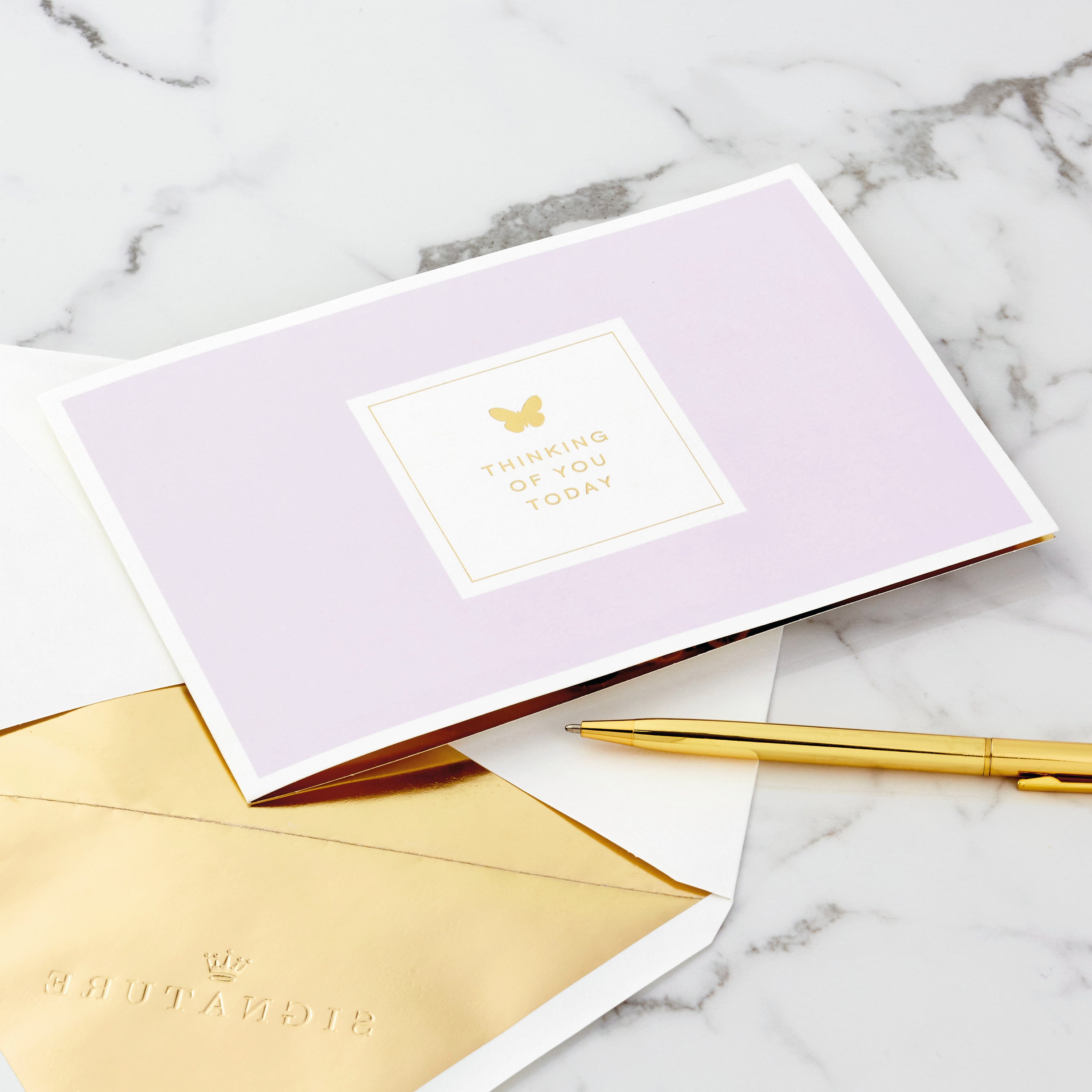Printed on high quality board, with a simple, internal pop-up mechanism, this stunning card features a gorgeous die and laser-cut, 3D 'butterflies' pop-up, with embossed elements, gold-foil details and lettering, and the message, 'Thinking of you today' on the front. The card comes complete with a Hallmark Signature branded, gold-foiled, white envelope.