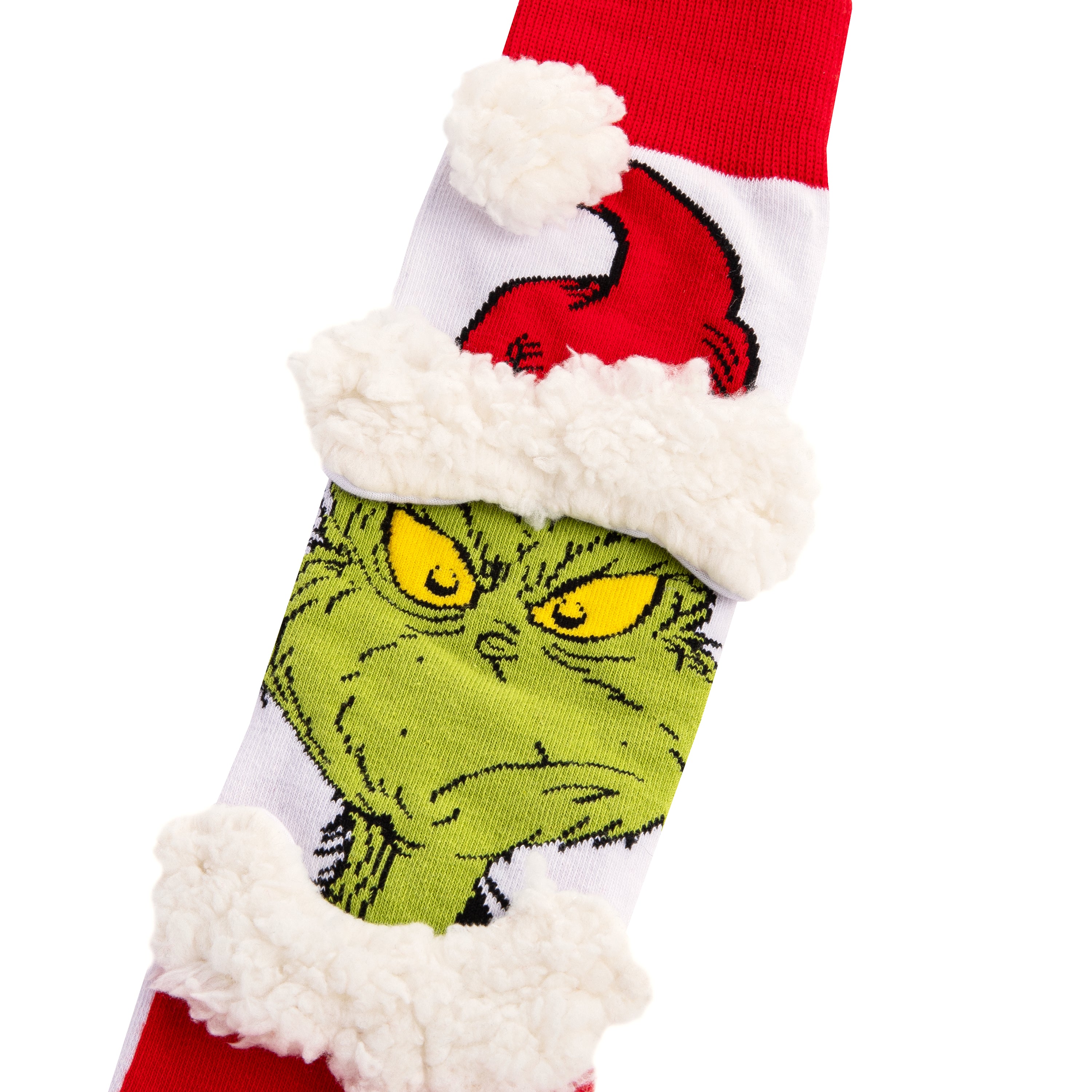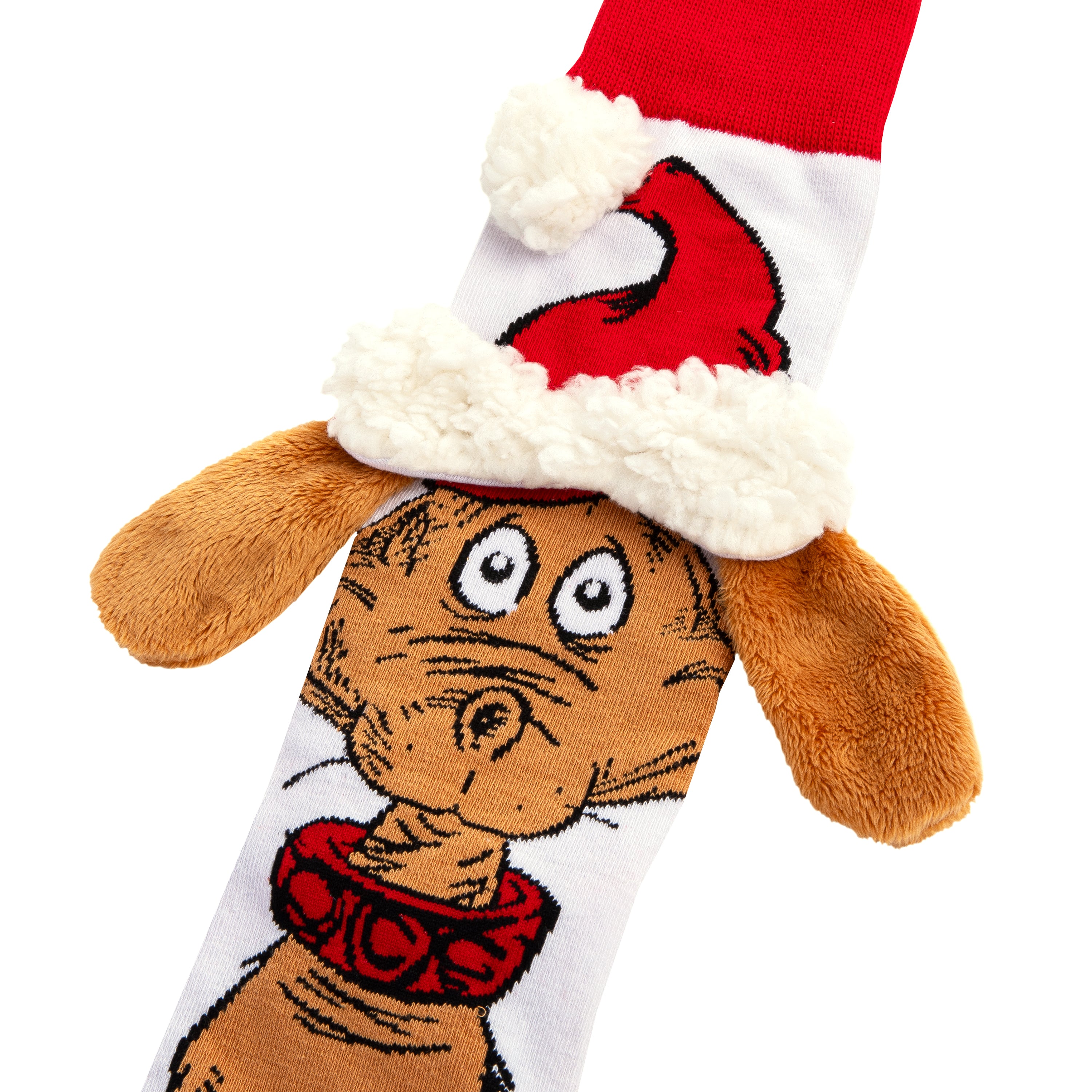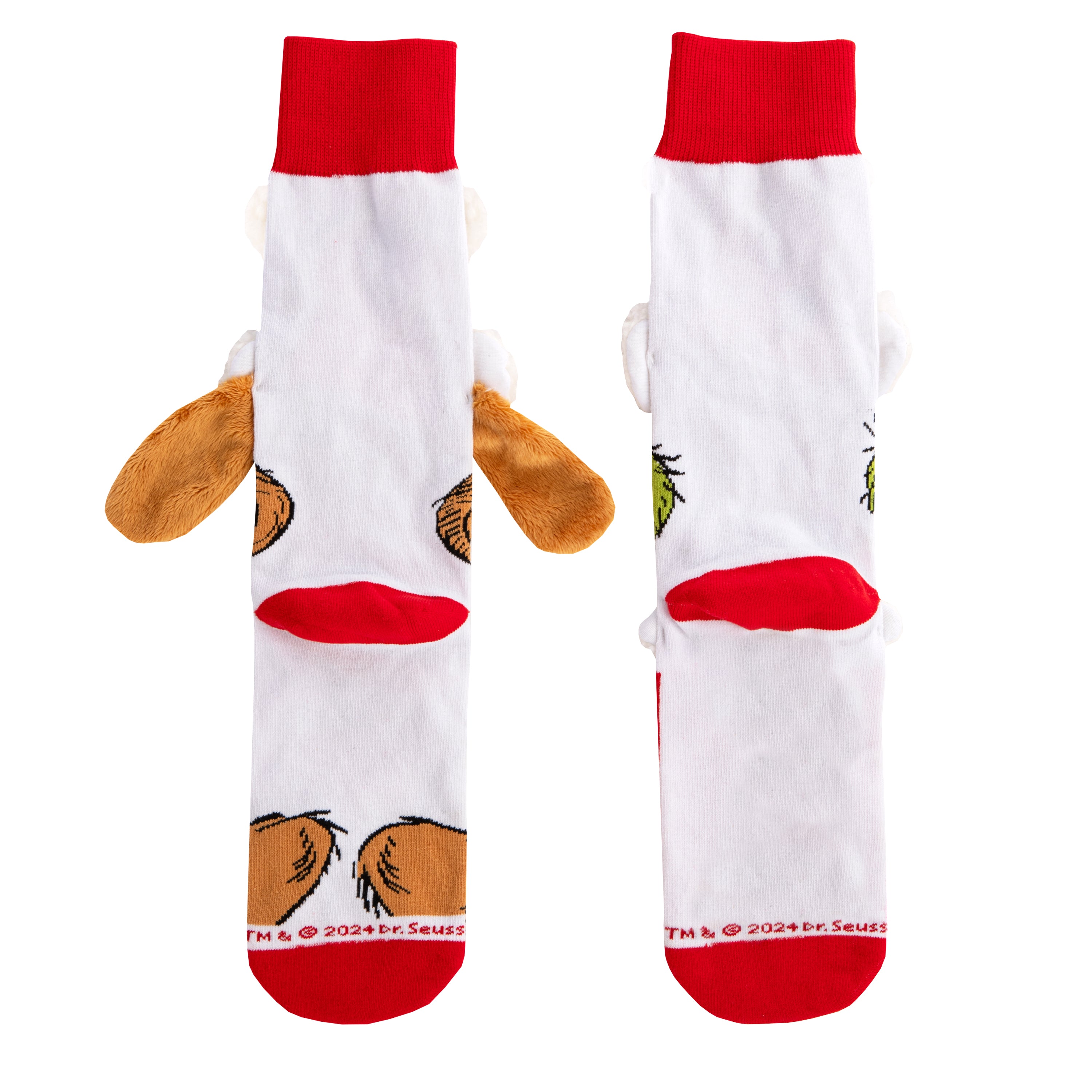 These socks feature 2 different designs, with The Grinch on the left sock and his dog Max on the right sock. The Grinch's outfit and Max's hat have extra fluffy trim, and Max's soft fluffy ears stick out from the sides.