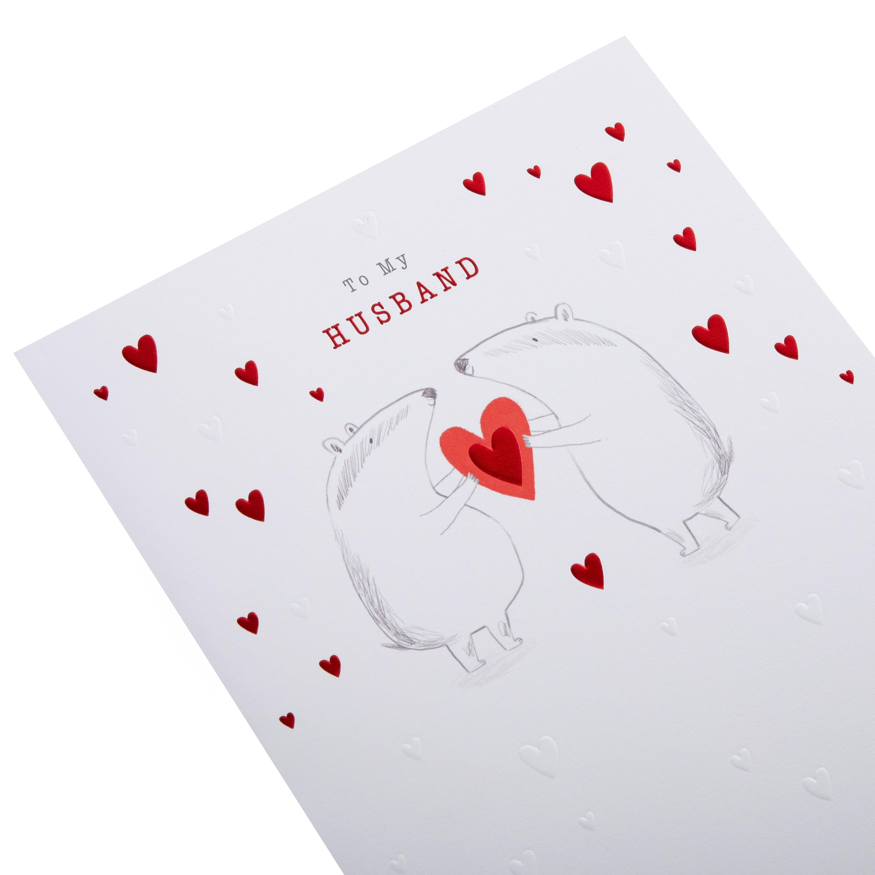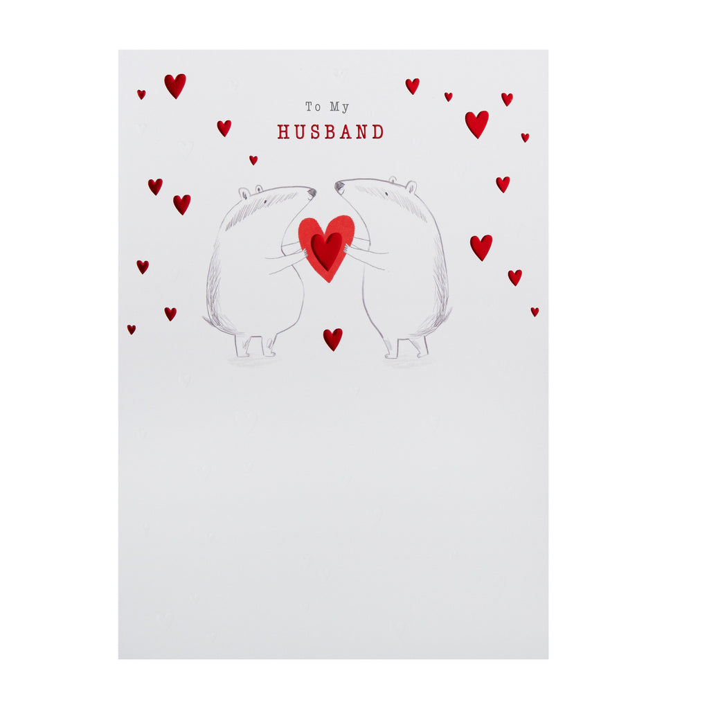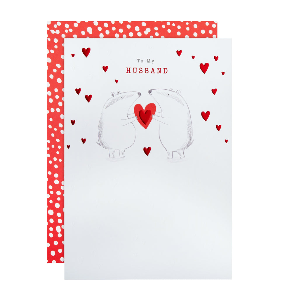 Printed on high-quality board, this Valentines card has a cute badgers with hearts illustration, and features embossed elements, metallic red foil details, 3D heart paper insert, and the message 'To my Husband' on the front. This card comes complete with a co-ordinating Hallmark branded, red with white spots patterned envelope.