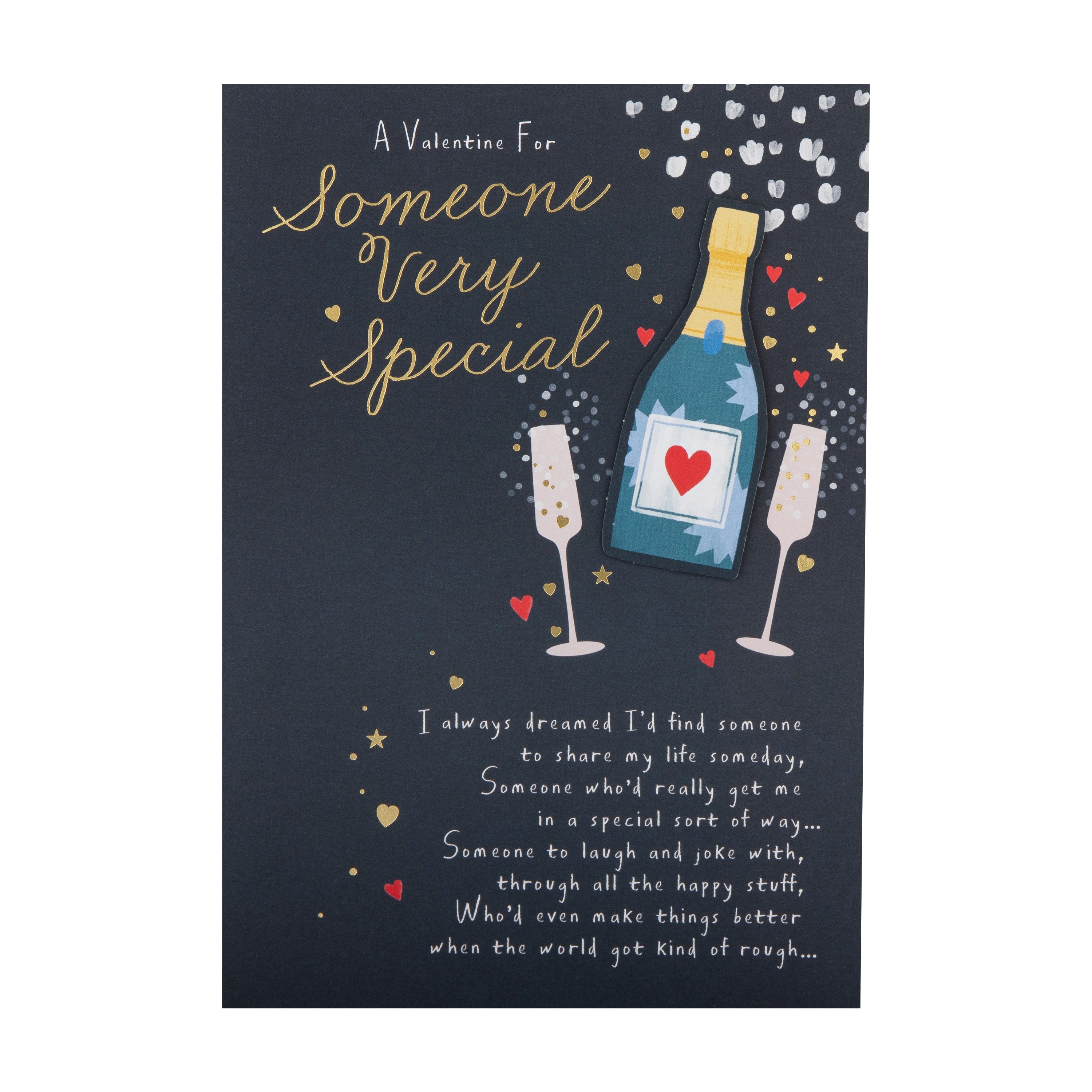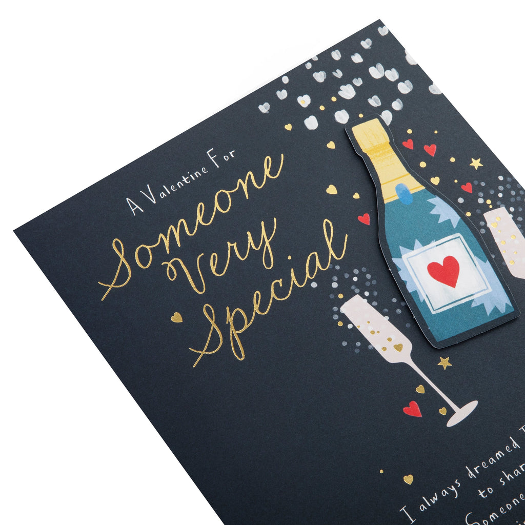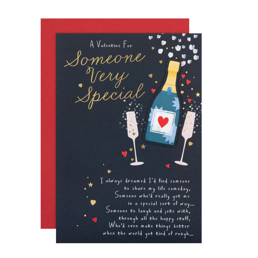 Printed on high-quality board, this Valentines card has a champagne bottle and glasses design, features die-cut, and the message 'A Valentine For Someone Very Special. I always dreamed I'd find someone to share my life someday, someone who'd really get me in a special sort of way... Someone to laugh and joke with, through all the happy stuff, who'd even make things better when the world got kind of rough...' on the front. This card comes complete with a co-ordinating Hallmark branded, red envelope.