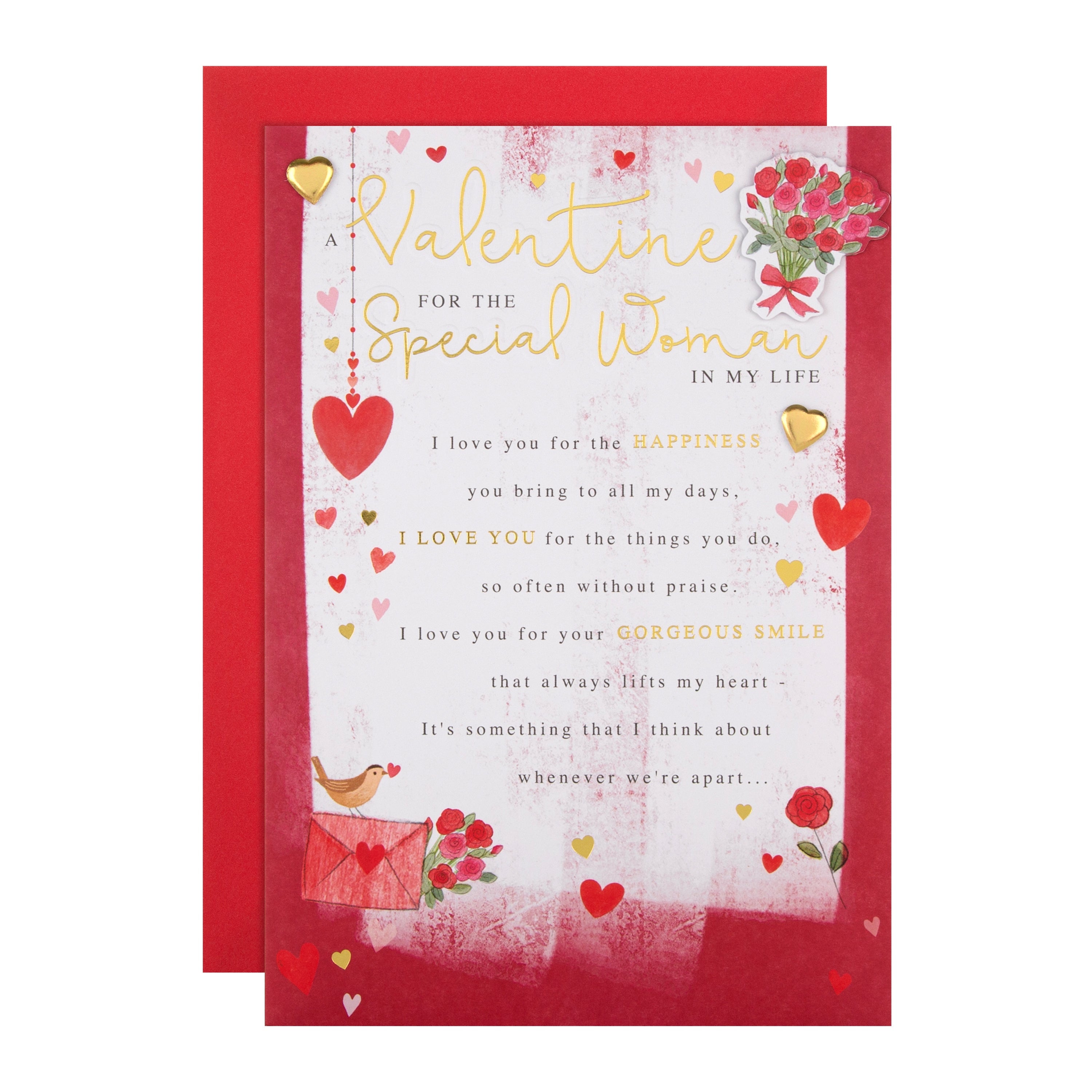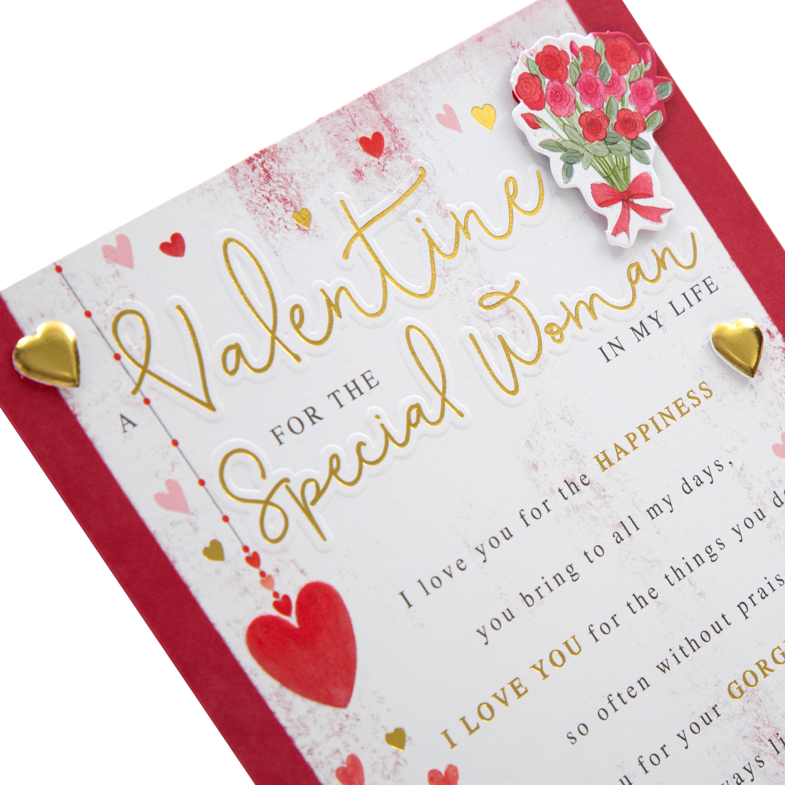 Printed on high-quality board, this card features a paper insert, gold foil details, gold paper heart gems, a 3D attachment, embossed elements and comes complete with a co-ordinating red, Hallmark branded envelope.